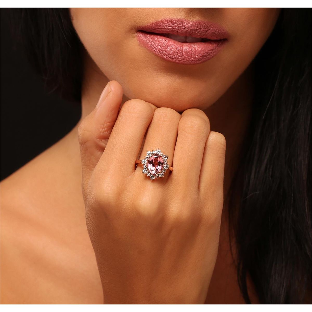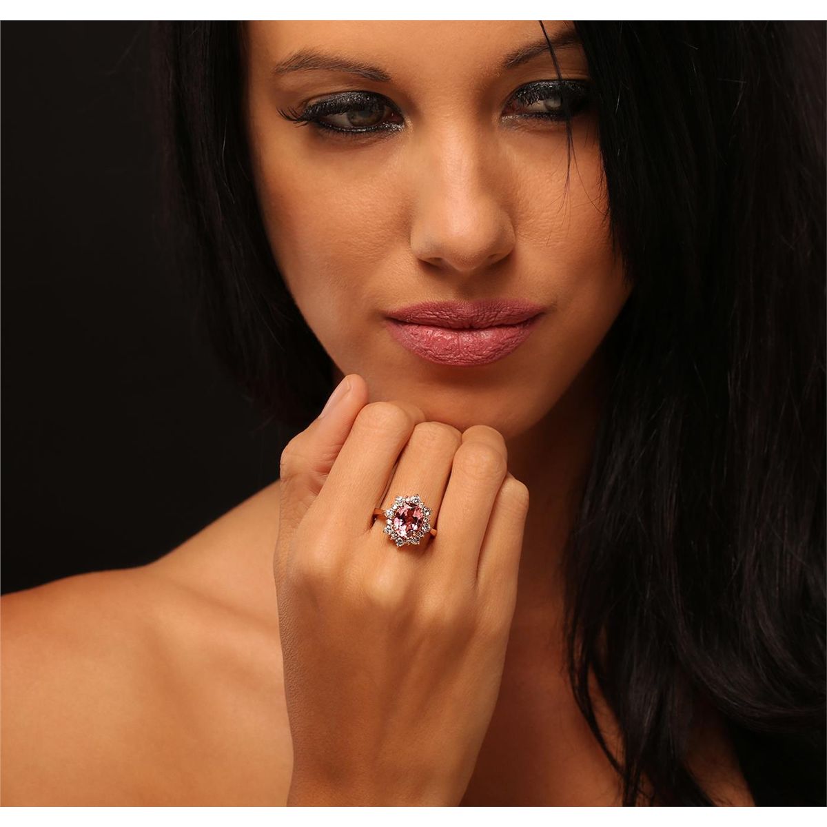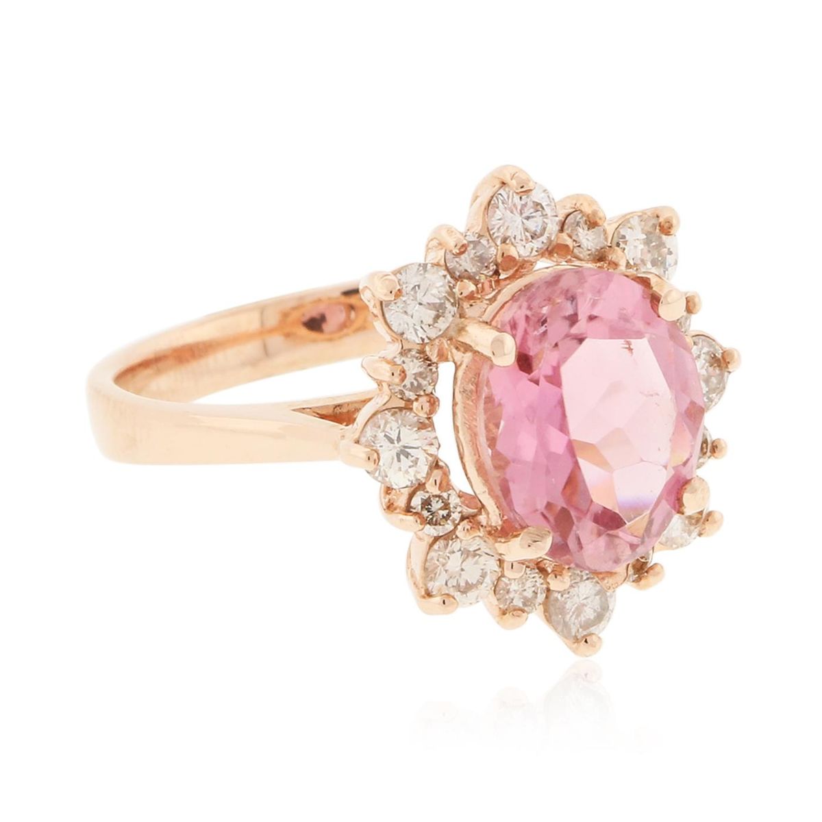 One electronically tested 14KT rose gold Ladies combination cast & assembled ring with a bright polish finish. Condition is new. Identified with markings of "K14". Containing: One prong set oval modified brilliant cut natural pink tourmaline, measuring 10.00 x 8.20 x 4.80mm, approximate weight of 2.51ct., clarity is eye clean, type II, medium light, moderately strong, reddish purple color, (GIA rP 4/4), cut is very good. Colored gemstones are presumed to have been subjected to commonly used color/clarity enhancement processes. Eight prong set round brilliant cut diamonds, measuring 2.30 - 2.30 x 1.38mm (depth est.) approximate. Total Weight of 8 Stones = 0.36ct. Clarity: SI-2 to I-1. Color: J - K, Cut is Good. Eight prong set round brilliant cut diamonds, measuring 1.50 - 1.50 x 0.90mm (depth est.) approximate. Total Weight of 8 Stones = 0.10ct. Clarity: I-1. Color: J - K, Cut is Good. Total Weight of Colored Stones 2.51ct. Total Weight of Diamonds 0.45ct. Total Weight of Ring 4.70 grams. GGL Appraised at $3,285.00.