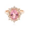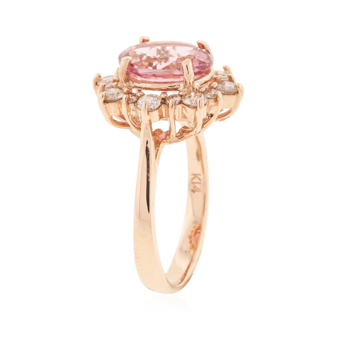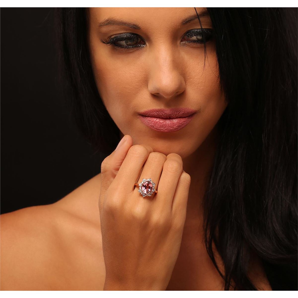 One electronically tested 14KT rose gold Ladies combination cast & assembled ring with a bright polish finish. Condition is new. Identified with markings of "K14". Containing: One prong set oval modified brilliant cut natural pink tourmaline, measuring 10.00 x 8.20 x 4.80mm, approximate weight of 2.51ct., clarity is eye clean, type II, medium light, moderately strong, reddish purple color, (GIA rP 4/4), cut is very good. Colored gemstones are presumed to have been subjected to commonly used color/clarity enhancement processes. Eight prong set round brilliant cut diamonds, measuring 2.30 - 2.30 x 1.38mm (depth est.) approximate. Total Weight of 8 Stones = 0.36ct. Clarity: SI-2 to I-1. Color: J - K, Cut is Good. Eight prong set round brilliant cut diamonds, measuring 1.50 - 1.50 x 0.90mm (depth est.) approximate. Total Weight of 8 Stones = 0.10ct. Clarity: I-1. Color: J - K, Cut is Good. Total Weight of Colored Stones 2.51ct. Total Weight of Diamonds 0.45ct. Total Weight of Ring 4.70 grams. GGL Appraised at $3,285.00.