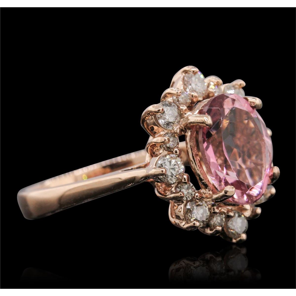 One electronically tested 14KT rose gold Ladies combination cast & assembled ring with a bright polish finish. Condition is new. Identified with markings of "K14". Containing: One prong set oval modified brilliant cut natural pink tourmaline, measuring 10.00 x 8.20 x 4.80mm, approximate weight of 2.51ct., clarity is eye clean, type II, medium light, moderately strong, reddish purple color, (GIA rP 4/4), cut is very good. Colored gemstones are presumed to have been subjected to commonly used color/clarity enhancement processes. Eight prong set round brilliant cut diamonds, measuring 2.30 - 2.30 x 1.38mm (depth est.) approximate. Total Weight of 8 Stones = 0.36ct. Clarity: SI-2 to I-1. Color: J - K, Cut is Good. Eight prong set round brilliant cut diamonds, measuring 1.50 - 1.50 x 0.90mm (depth est.) approximate. Total Weight of 8 Stones = 0.10ct. Clarity: I-1. Color: J - K, Cut is Good. Total Weight of Colored Stones 2.51ct. Total Weight of Diamonds 0.45ct. Total Weight of Ring 4.70 grams. GGL Appraised at $3,285.00.