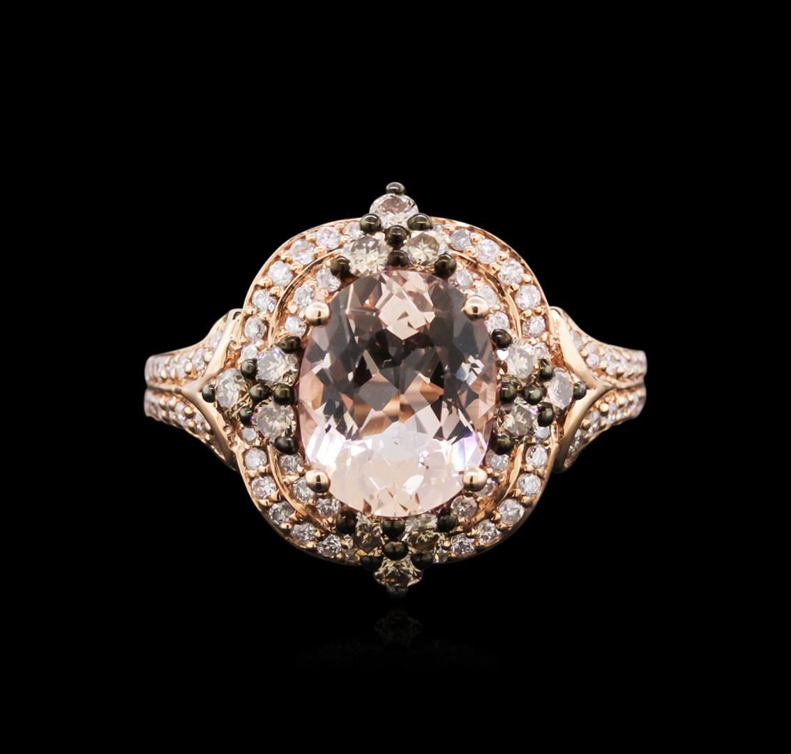 One ring featuring: 14KT rose gold weighing 3.44 grams containing one morganite center stone with a total weight of 2.52ct, 12 brown diamonds with a total weight of 0.44ct, and 68 round white diamonds with a total weight of 0.39ct.