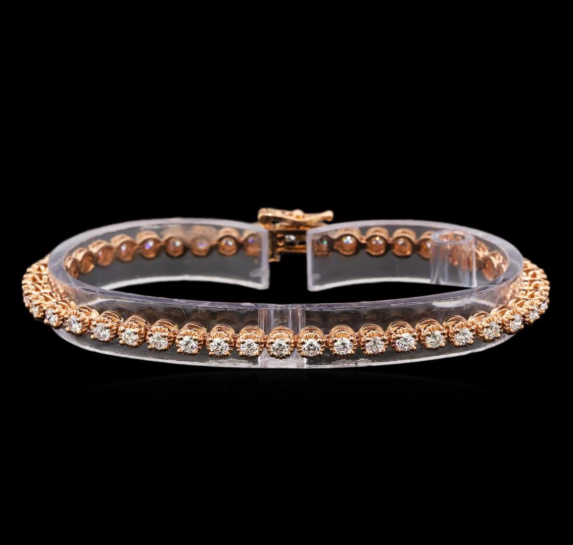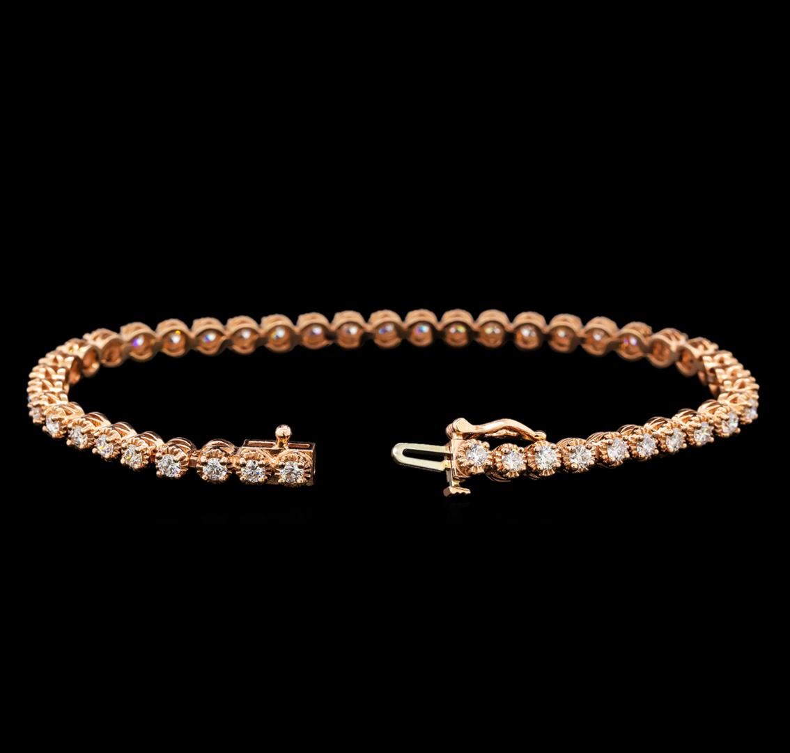 One electronically tested 14KT rose gold ladies cast diamond tennis bracelet with a hidden box clasp with safety closer with a bright polish finish. Measurements: 7 " in length Identified with markings of "14K". Condition is new. Containing: Forty-Five prong set round brilliant cut diamonds, measuring 2.50 - 2.50 x 1.50mm (depth est.) approximate total weight of 45 Stones = 2.57ct. Clarity: VS-2 to SI-1. Color: G - H, Cut is Good. All diamonds are graded in the mounting, unless otherwise stated. Total Weight of Diamonds 2.57ct. Total Weight of Tennis Bracelet 11.80 grams. GGL Appraised at $8,660.00.