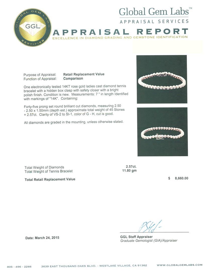 One electronically tested 14KT rose gold ladies cast diamond tennis bracelet with a hidden box clasp with safety closer with a bright polish finish. Measurements: 7 " in length Identified with markings of "14K". Condition is new. Containing: Forty-Five prong set round brilliant cut diamonds, measuring 2.50 - 2.50 x 1.50mm (depth est.) approximate total weight of 45 Stones = 2.57ct. Clarity: VS-2 to SI-1. Color: G - H, Cut is Good. All diamonds are graded in the mounting, unless otherwise stated. Total Weight of Diamonds 2.57ct. Total Weight of Tennis Bracelet 11.80 grams. GGL Appraised at $8,660.00.