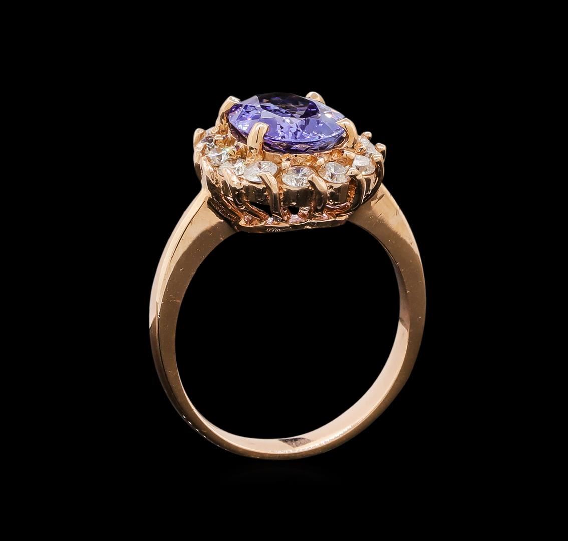 One electronically tested 14KT rose gold ladies cast tanzanite and diamond ring with a bright polish finish. Identified with markings of "K14". Condition is new. Containing: One prong set oval modified brilliant cut natural tanzanite, measuring 10.10 x 8.00 x 4.72mm, approximate weight of 2.68ct., clarity is eye clean, type I, medium light, very slightly grayish, violet color, (GIA V 4/3), cut is good. Thirteen prong set round brilliant cut diamonds, measuring 2.30 - 2.30 x 1.38mm (depth est.) approximate total weight of 13 Stones = 0.58ct. Clarity: SI-1 to SI-2. Color: K - L, Cut is Good. Colored gemstones are presumed to have been subjected to commonly used enhancement processes. All diamonds and colored gemstones are graded in the mounting, unless otherwise stated. Total Weight of Colored Stones 2.68ct. Total Weight of Diamonds 0.58ct. Total Weight of Ring 5.40 grams. GGL Appraised at $3,920.00.