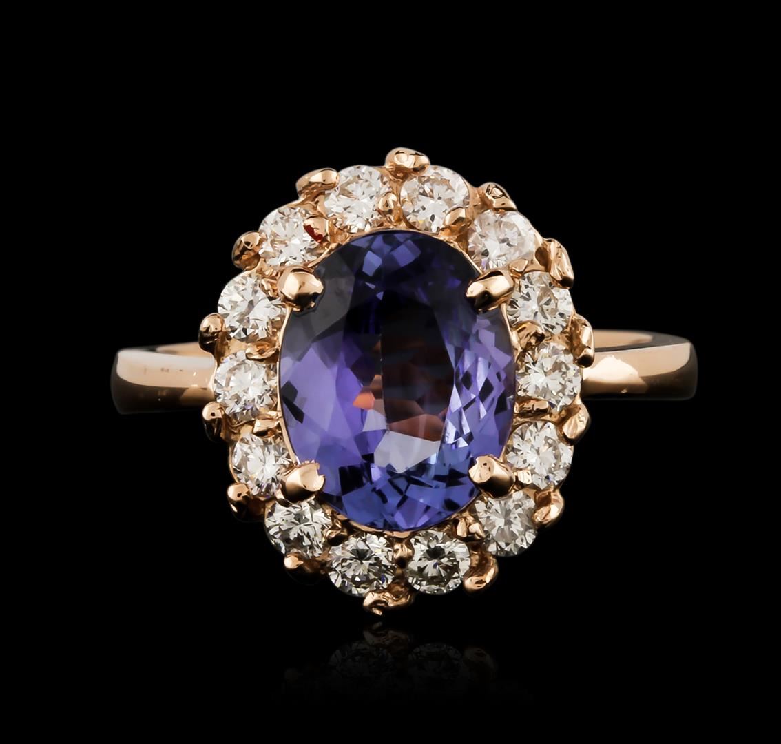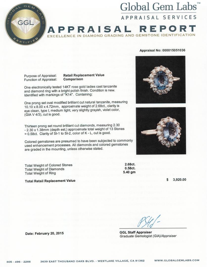 One electronically tested 14KT rose gold ladies cast tanzanite and diamond ring with a bright polish finish. Identified with markings of "K14". Condition is new. Containing: One prong set oval modified brilliant cut natural tanzanite, measuring 10.10 x 8.00 x 4.72mm, approximate weight of 2.68ct., clarity is eye clean, type I, medium light, very slightly grayish, violet color, (GIA V 4/3), cut is good. Thirteen prong set round brilliant cut diamonds, measuring 2.30 - 2.30 x 1.38mm (depth est.) approximate total weight of 13 Stones = 0.58ct. Clarity: SI-1 to SI-2. Color: K - L, Cut is Good. Colored gemstones are presumed to have been subjected to commonly used enhancement processes. All diamonds and colored gemstones are graded in the mounting, unless otherwise stated. Total Weight of Colored Stones 2.68ct. Total Weight of Diamonds 0.58ct. Total Weight of Ring 5.40 grams. GGL Appraised at $3,920.00.
