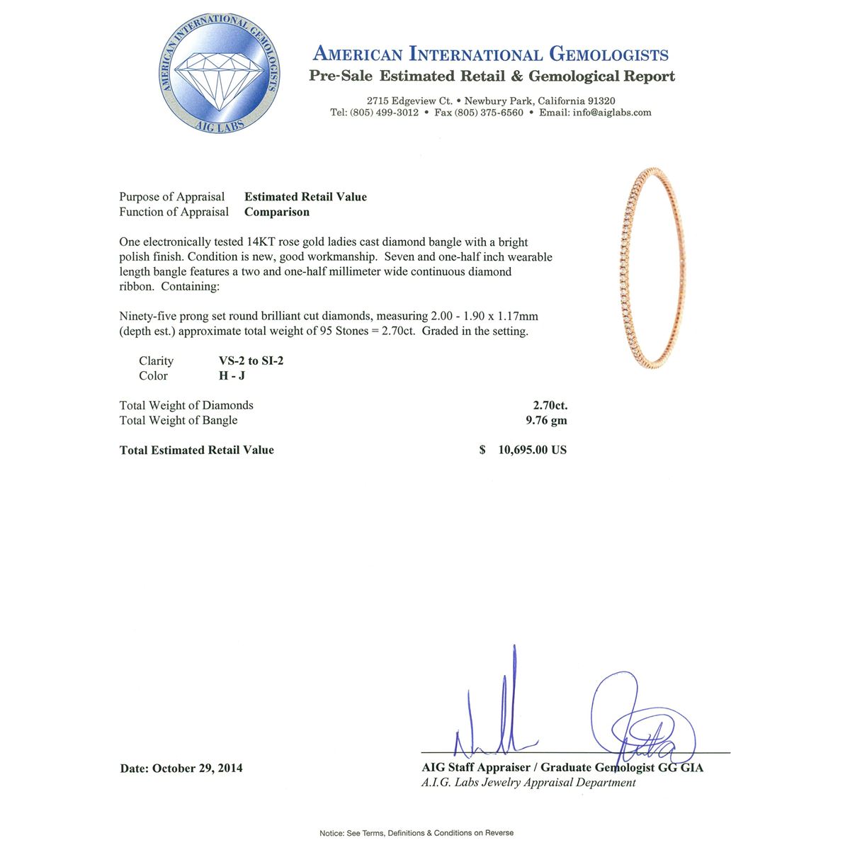 One electronically tested 14KT rose gold ladies cast diamond bangle with a bright polish finish. Seven and one-half inch wearable length bangle features a two and one-half millimeter wide continuous diamond ribbon. Condition is new, good workmanship. Containing: Ninety-Five prong set round brilliant cut diamonds, measuring 2.00 - 1.90 x 1.17mm (depth est.) approximate total weight of 95 Stones = 2.70ct. Graded in the setting. Clarity: VS-2 to SI-2. Color: H - J. Total Weight of Diamonds 2.70ct. Total Weight of Bangle 9.76 grams. AIG Appraised at $10,695.00.