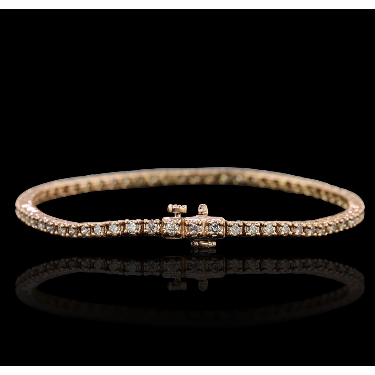 One electronically tested 14KT rose gold Ladies combination cast & assembled tennis bracelet with a hidden box clasp with a bright polish finish. Condition is new. Measurements: 7" in length. Identified with markings of "14K". Containing: Sixty-One prong set round brilliant cut diamonds, measuring 2.30 - 2.30 x 1.38mm (depth est.) approximate. Total Weight of 61 Stones = 2.72ct. Clarity: I-1 to I-2. Color: K - L, Cut is Good. Total Weight of Diamonds 2.72ct. Total Weight of Bracelet 11.20 grams. GGL Appraised at $8,000.00.