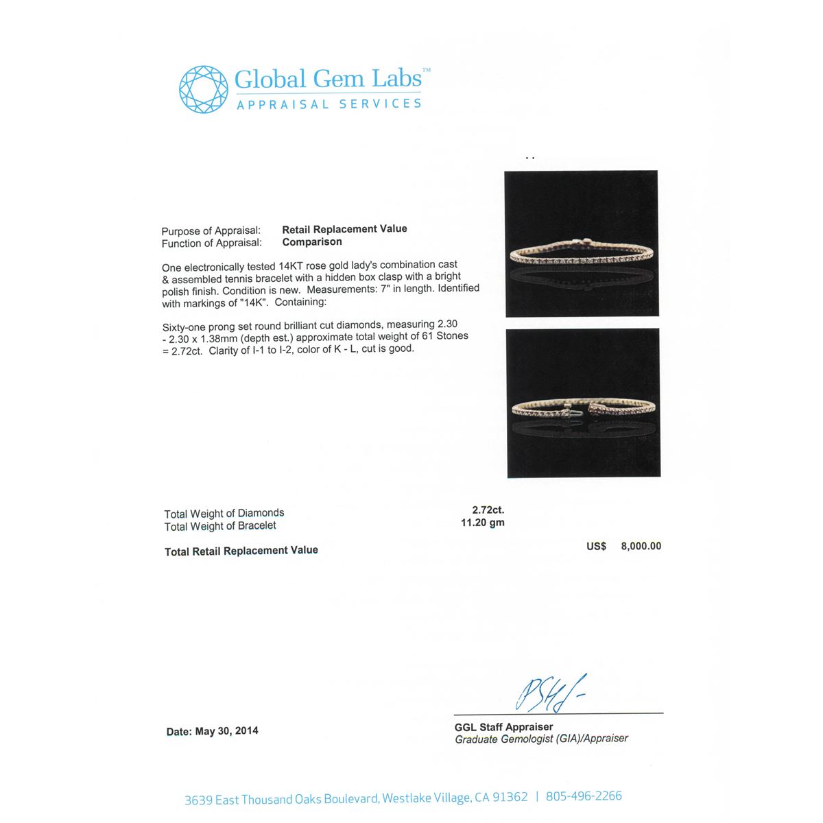 One electronically tested 14KT rose gold Ladies combination cast & assembled tennis bracelet with a hidden box clasp with a bright polish finish. Condition is new. Measurements: 7" in length. Identified with markings of "14K". Containing: Sixty-One prong set round brilliant cut diamonds, measuring 2.30 - 2.30 x 1.38mm (depth est.) approximate. Total Weight of 61 Stones = 2.72ct. Clarity: I-1 to I-2. Color: K - L, Cut is Good. Total Weight of Diamonds 2.72ct. Total Weight of Bracelet 11.20 grams. GGL Appraised at $8,000.00.