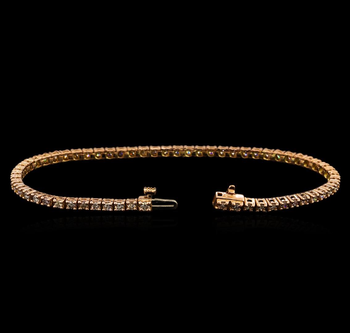 One electronically tested 14KT rose gold Ladies combination cast & assembled tennis bracelet with a hidden box clasp with a bright polish finish. Condition is new. Measurements: 7" in length. Identified with markings of "14K". Containing: Sixty-One prong set round brilliant cut diamonds, measuring 2.30 - 2.30 x 1.38mm (depth est.) approximate. Total Weight of 61 Stones = 2.72ct. Clarity: I-1 to I-2. Color: K - L, Cut is Good. Total Weight of Diamonds 2.72ct. Total Weight of Bracelet 11.20 grams. GGL Appraised at $8,000.00.