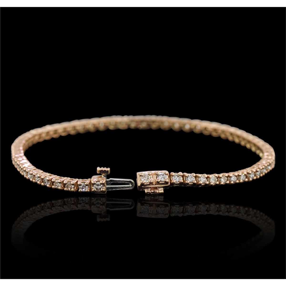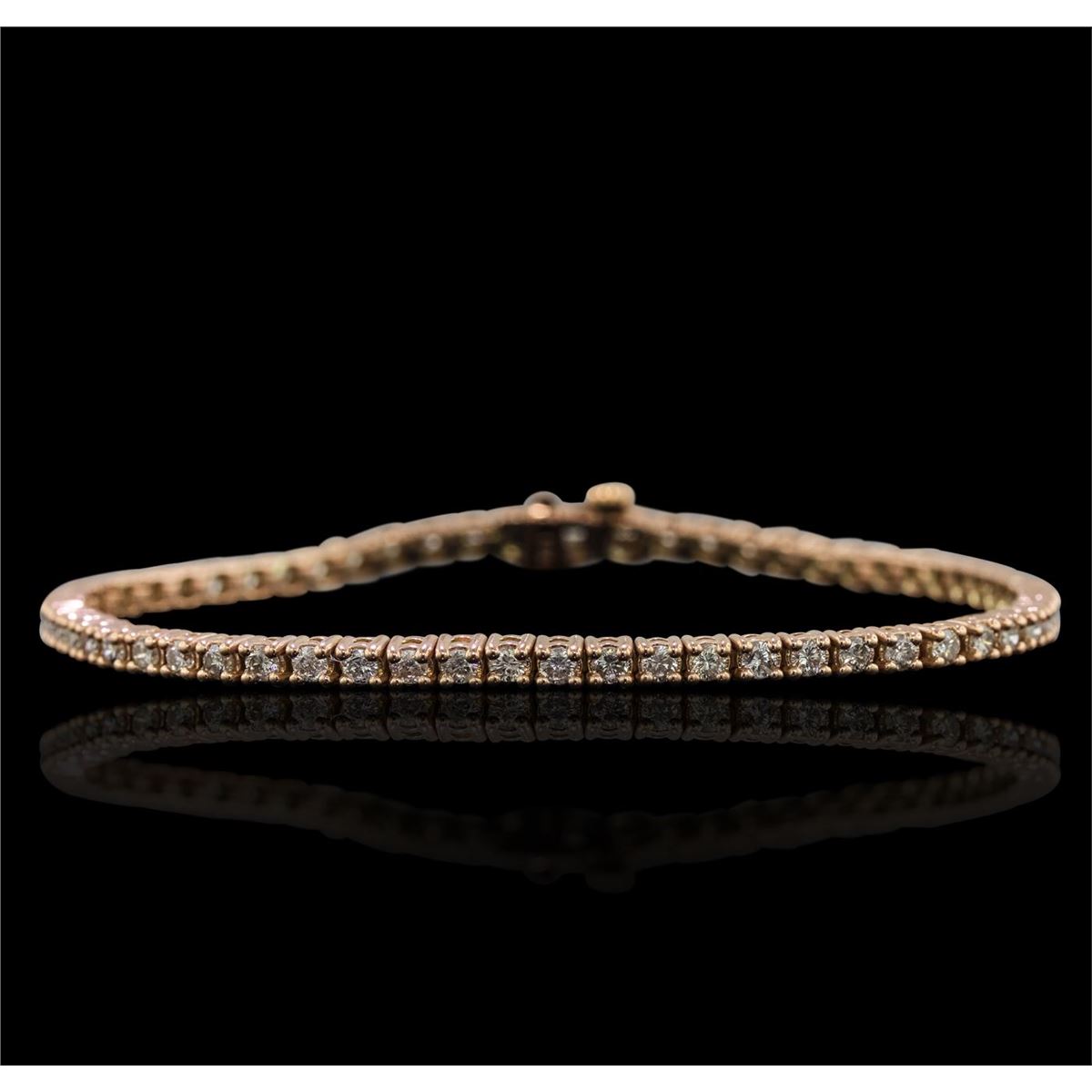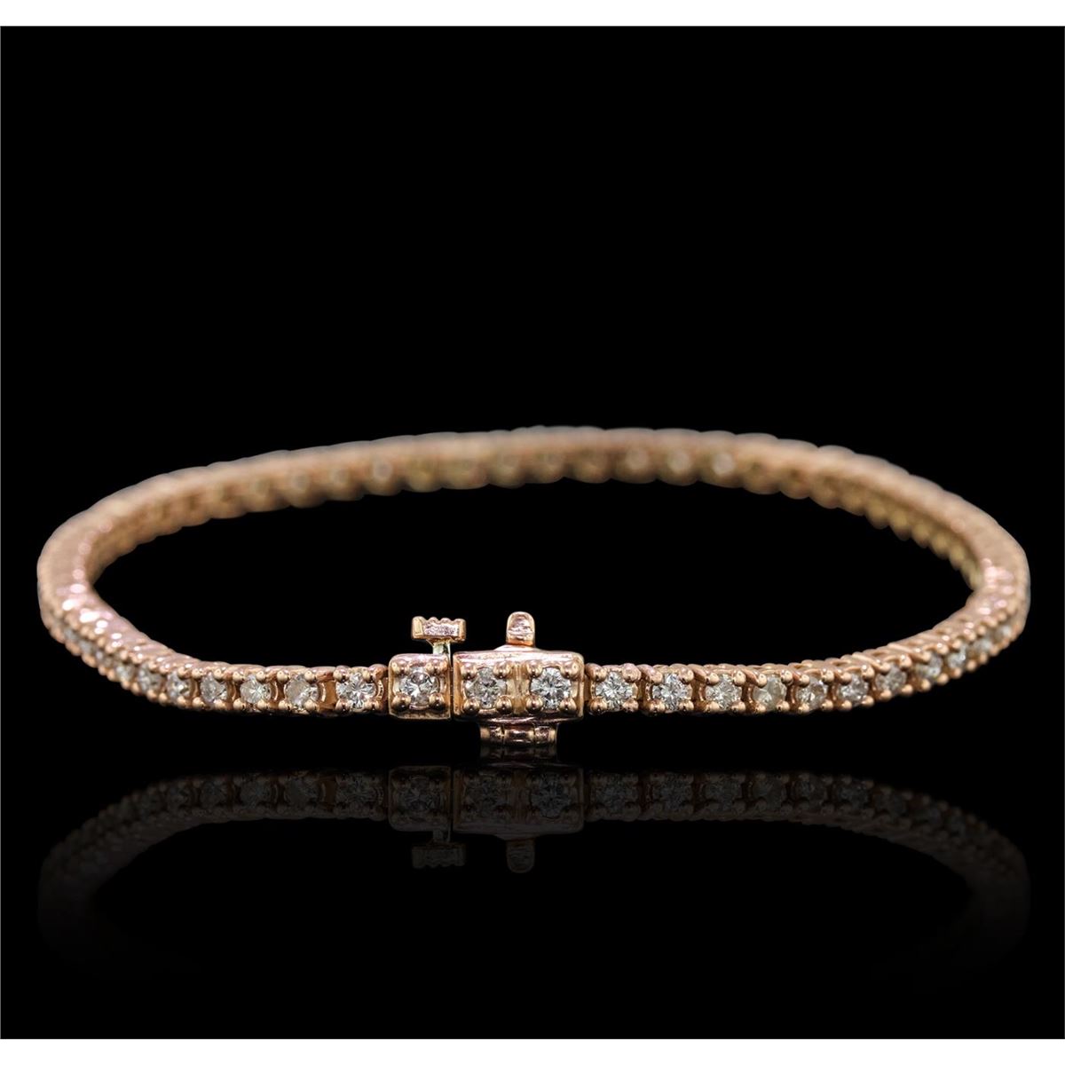 One electronically tested 14KT rose gold Ladies combination cast & assembled tennis bracelet with a hidden box clasp with a bright polish finish. Condition is new. Measurements: 7" in length. Identified with markings of "14K". Containing: Sixty-One prong set round brilliant cut diamonds, measuring 2.30 - 2.30 x 1.38mm (depth est.) approximate. Total Weight of 61 Stones = 2.72ct. Clarity: I-1 to I-2. Color: I - J, Cut is Good. Total Weight of Diamonds 2.72ct. Total Weight of Bracelet 11.10 grams. GGL Appraised at $8,245.00.