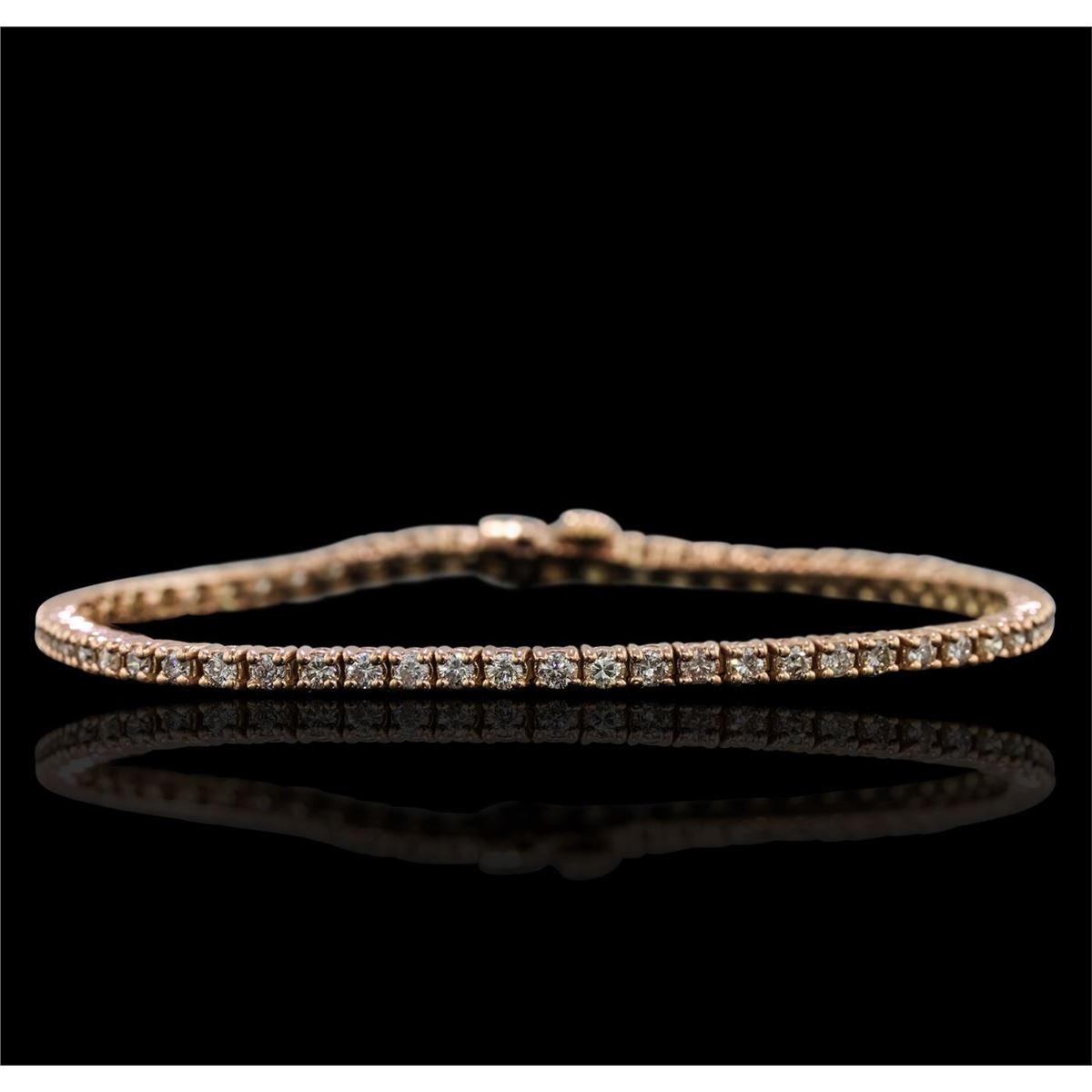 One electronically tested 14KT rose gold Ladies combination cast & assembled tennis bracelet with a hidden box clasp with a bright polish finish. Condition is new. Measurements: 7" in length. Identified with markings of "14K". Containing: Sixty-One prong set round brilliant cut diamonds, measuring 2.30 - 2.30 x 1.38mm (depth est.) approximate. Total Weight of 61 Stones = 2.72ct. Clarity: I-1 to I-2. Color: K - L, Cut is Good. Total Weight of Diamonds 2.72ct. Total Weight of Bracelet 11.20 grams. GGL Appraised at $8,000.00.