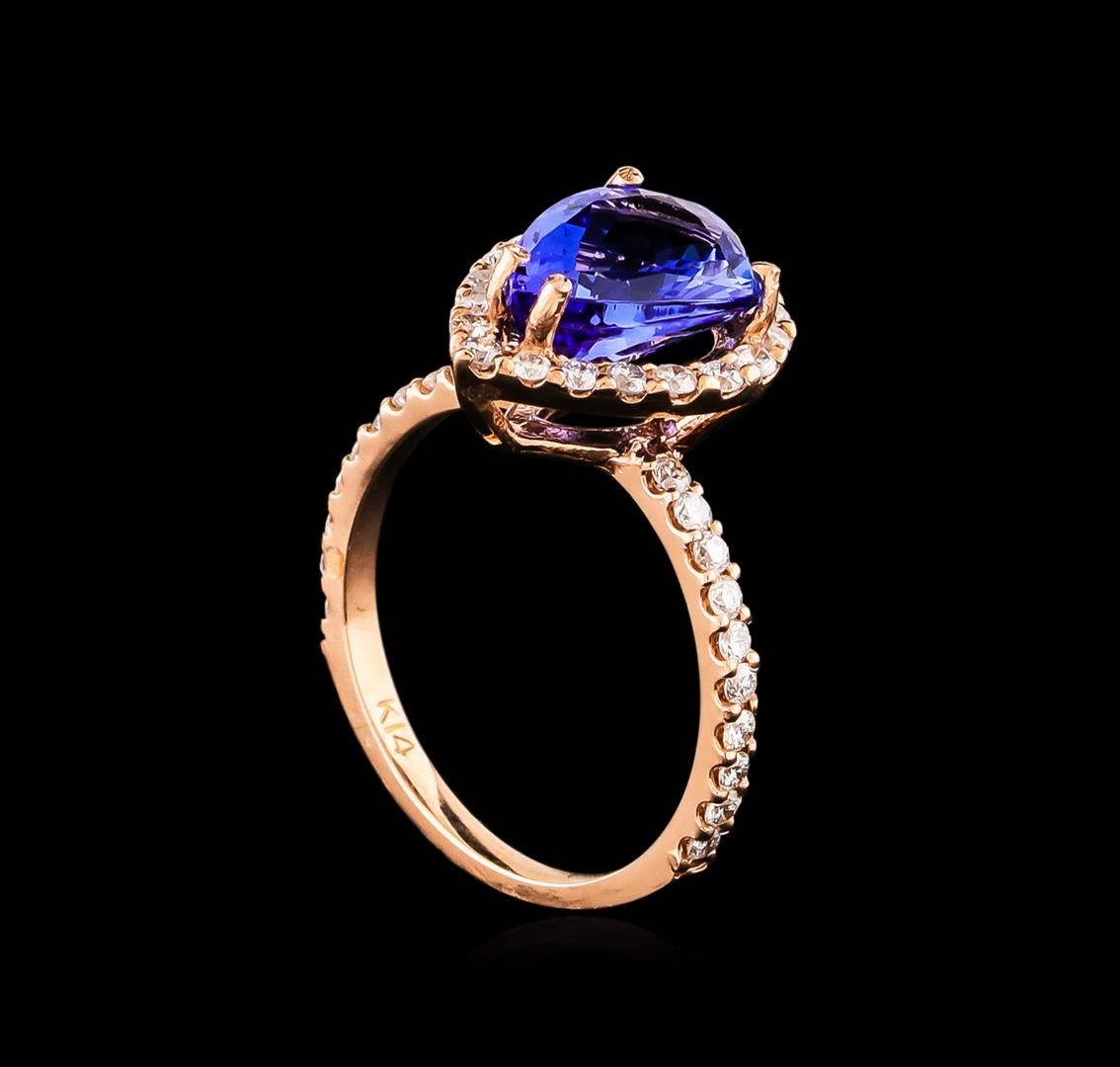 One electronically tested 14KT rose gold Ladies combination cast & assembled ring with a bright polish finish. Condition is new. Identified with markings of "14K". Containing: One prong set pear modified brilliant cut natural tanzanite, measuring 10.09 x 7.95 x 5.16mm, approximate. Total Weight of 2.77ct., clarity is eye clean, type I, medium, moderately strong, bluish violet color, (GIA bV 5/4), cut is good. Forty prong set round brilliant cut diamonds, measuring 1.50 - 1.50 x 0.90mm (depth est.) approximate. Total Weight of 40 Stones = 0.49ct. Clarity: I-1 to I-2. Color: I - J, Cut is Good. Colored gemstones are presumed to have been subjected to commonly used enhancement processes. All diamonds and colored gemstones are graded in the mounting, unless otherwise stated. Total Weight of Colored Stones 2.77ct. Total Weight of Diamonds 0.49ct. Total Weight of Ring 3.70 grams.