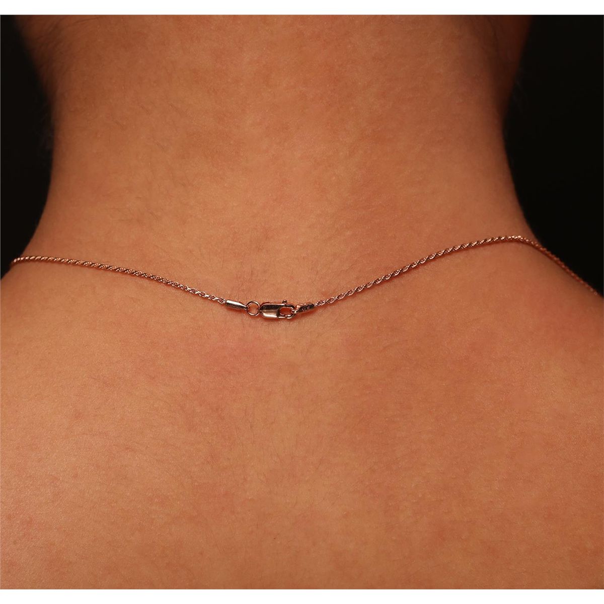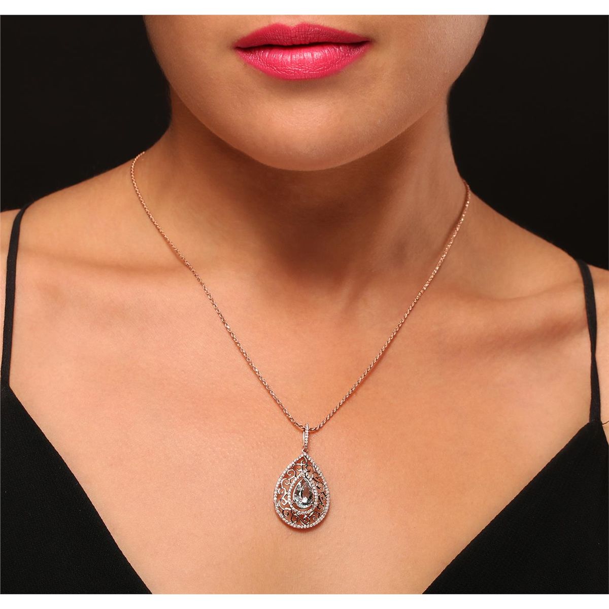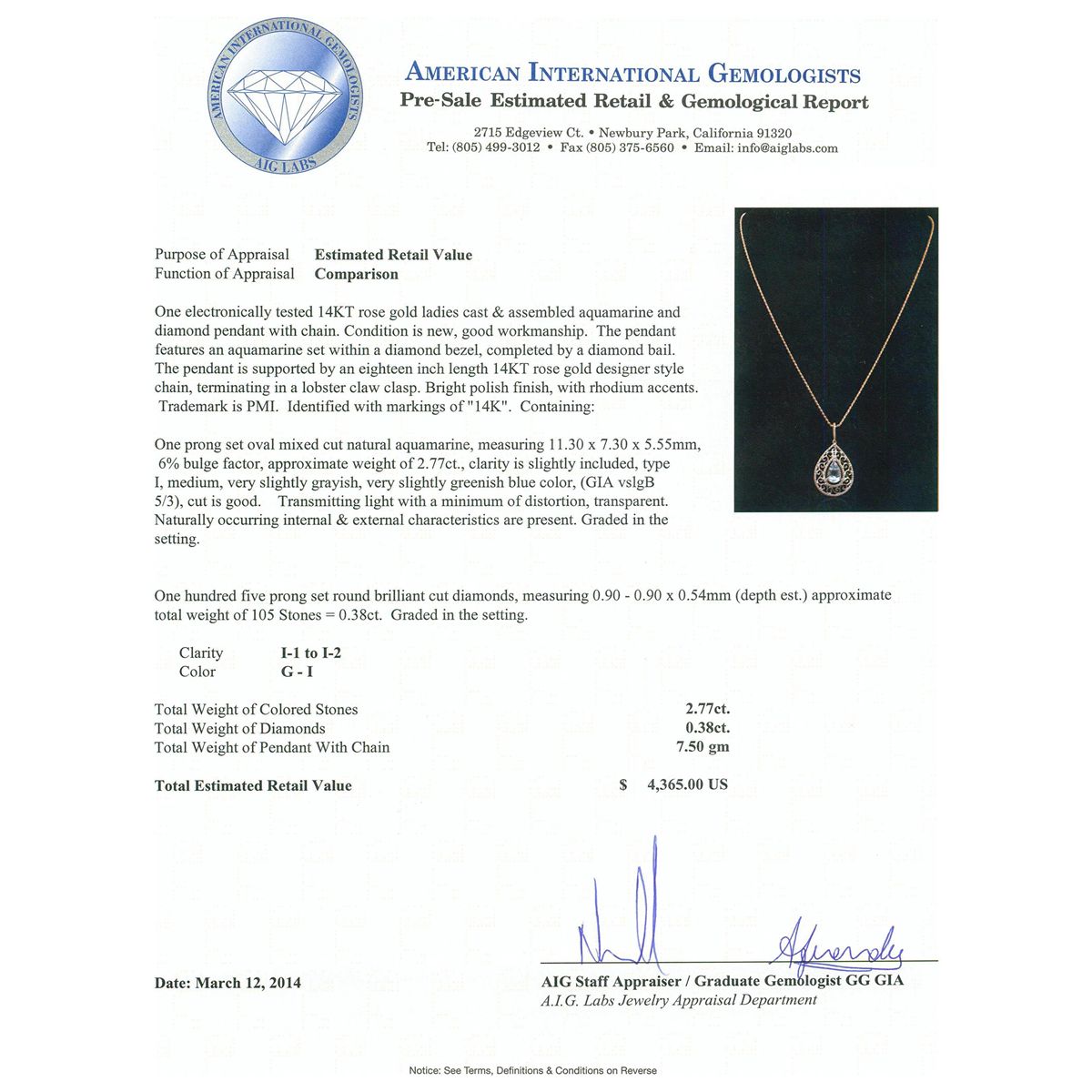 One electronically tested 14KT rose gold ladies cast & assembled aquamarine and diamond pendant with chain. Condition is new, good workmanship. The pendant features an aquamarine set within a diamond bezel, completed by a diamond bail. The pendant is supported by an eighteen inch length 14KT rose gold designer style chain, terminating in a lobster claw clasp. Bright polish finish, with rhodium accents. Trademark is PMI. Identified with markings of "14K". Containing: One prong set oval mixed cut natural aquamarine, measuring 11.30 x 7.30 x 5.55mm, 6%. bulge factor, approximate weight of 2.77ct., clarity is slightly included, type I, medium, very slightly grayish, very slightly greenish blue color, (GIA vslgB 5/3), cut is good. Transmitting light with a minimum of distortion, transparent. Naturally occurring internal & external characteristics are present. Graded in the setting. One Hundred Five prong set round brilliant cut diamonds, measuring 0.90 - 0.90 x 0.54mm (depth est.) approximate. Total Weight of 105 Stones = 0.38ct. Graded in the setting. Clarity: I-1 to I-2. Color: G - I. Total Weight of Colored Stones 2.77ct. Total Weight of Diamonds 0.38ct. Total Weight of Pendant With Chain 7.50 grams. AIG Appraised at $4,365.00.