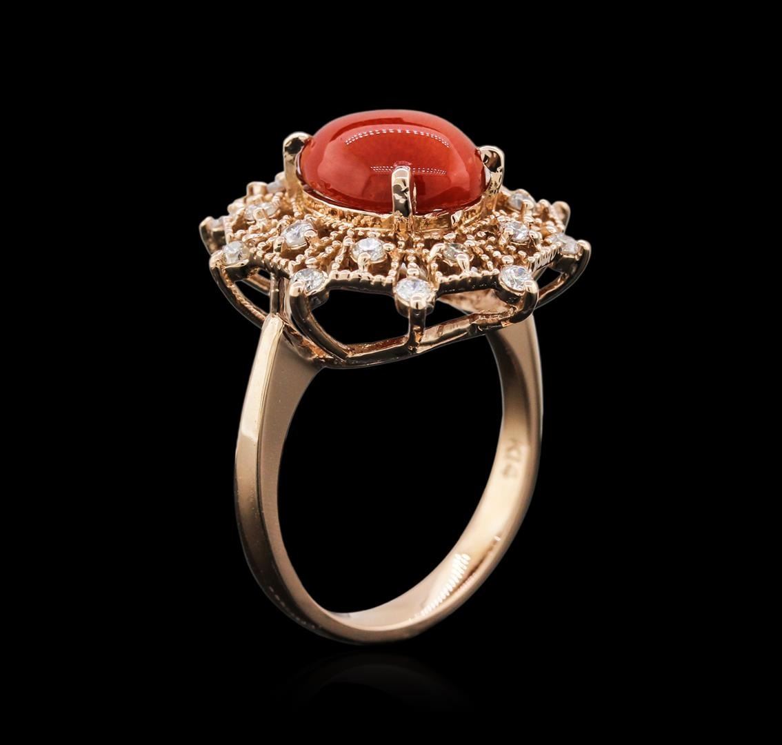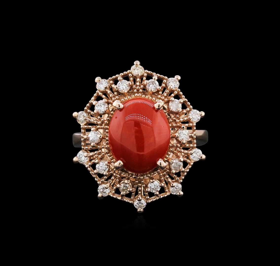 One electronically tested 14KT rose gold ladies cast coral and diamond ring with a flat shank with rounded edges with a bright polish finish. Identified with markings of "K14". Condition is new. Containing: One prong set oval cabochon cut natural red coral, measuring 11.10 x 9.04 x 3.93mm, exact weight 2.82ct., clarity is heavily included, medium dark, brownish, red color, (GIA R 6/1), cut is good. Twenty prong set round brilliant cut diamonds, measuring 1.60 - 1.60 x 0.96mm (depth est.) approximate total weight of 20 Stones = 0.46ct. Clarity: SI-2 to I-2. Color: I - J, Cut is Good. All diamonds and colored gemstones are graded in the mounting, unless otherwise stated. Colored gemstones are presumed to have been subjected to commonly used enhancement processes. Total Weight of Colored Stones 2.82ct. Total Weight of Diamonds 0.46ct. Total Weight of Ring 6.00 grams. GGL Appraised.