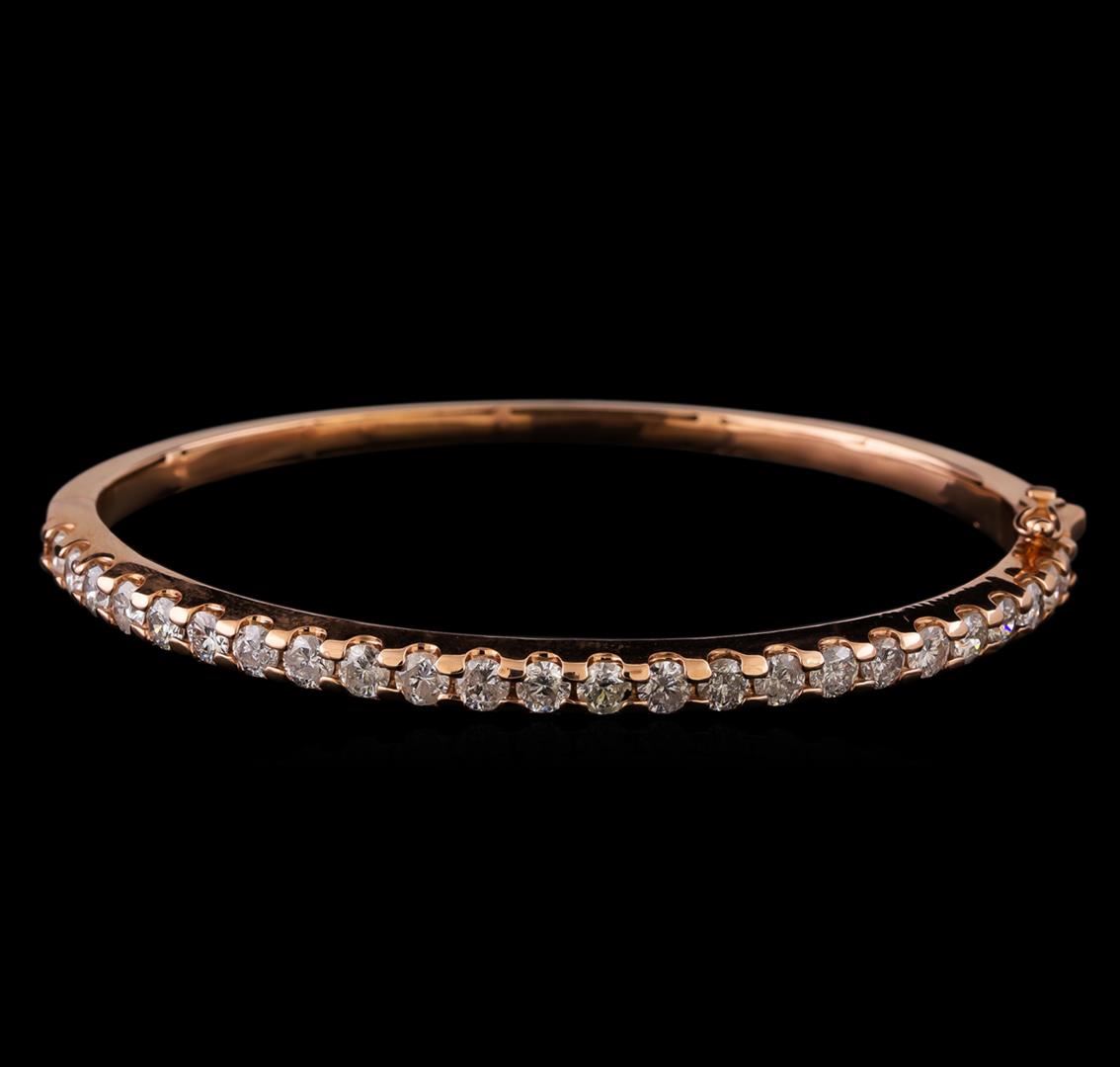 One electronically tested 14KT rose gold ladies combination cast & assembled bangle bracelet with a hidden box clasp with safety closer with a bright polish finish. Measurements: 2.50 x 2.00. Identified with markings of K14. Condition is new. Containing: Twenty-Four prong set round brilliant cut diamonds, measuring 3.20 - 3.20 x 1.92mm (depth est.) approximate total weight of 24 Stones = 2.88ct. Clarity: I-1 to I-2. Color: I - J, Cut is Good. All diamonds are graded in the mounting, unless otherwise stated. Total Weight of Diamonds 2.88ct. Total Weight of Bracelet 14.80 grams. GGL Appraised at $7,725.00.
