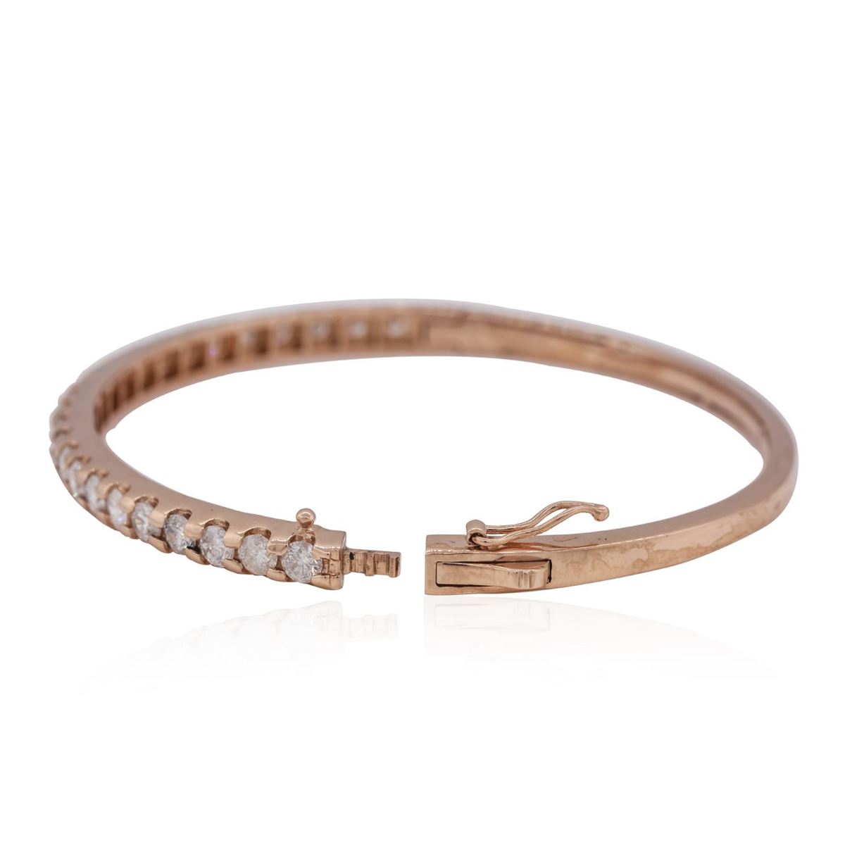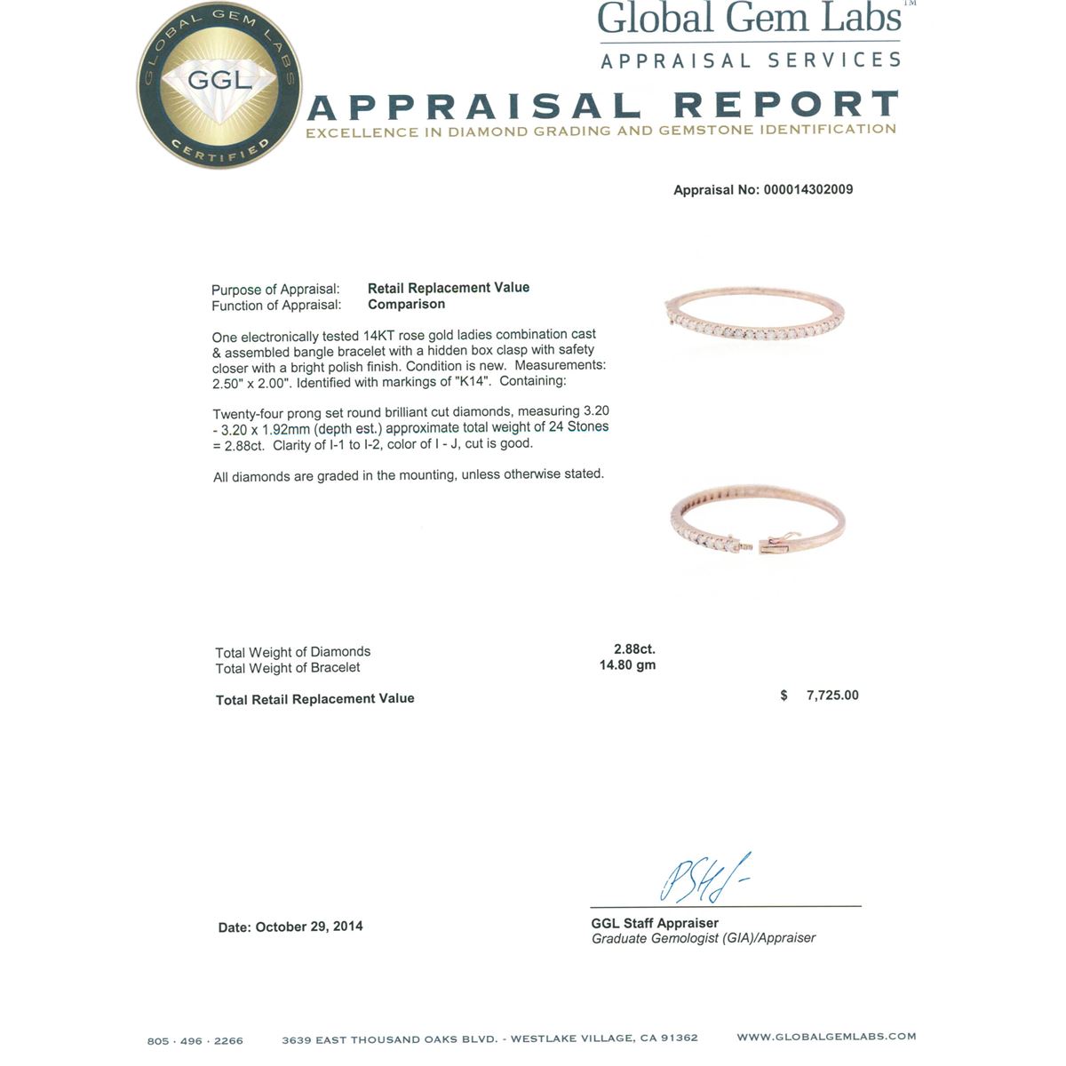 One electronically tested 14KT rose gold ladies combination cast & assembled bangle bracelet with a hidden box clasp with safety closer with a bright polish finish. Measurements: 2.50 x 2.00. Identified with markings of K14. Condition is new. Containing: Twenty-Four prong set round brilliant cut diamonds, measuring 3.20 - 3.20 x 1.92mm (depth est.) approximate total weight of 24 Stones = 2.88ct. Clarity: I-1 to I-2. Color: I - J, Cut is Good. All diamonds are graded in the mounting, unless otherwise stated. Total Weight of Diamonds 2.88ct. Total Weight of Bracelet 14.80 grams. GGL Appraised at $7,725.00.