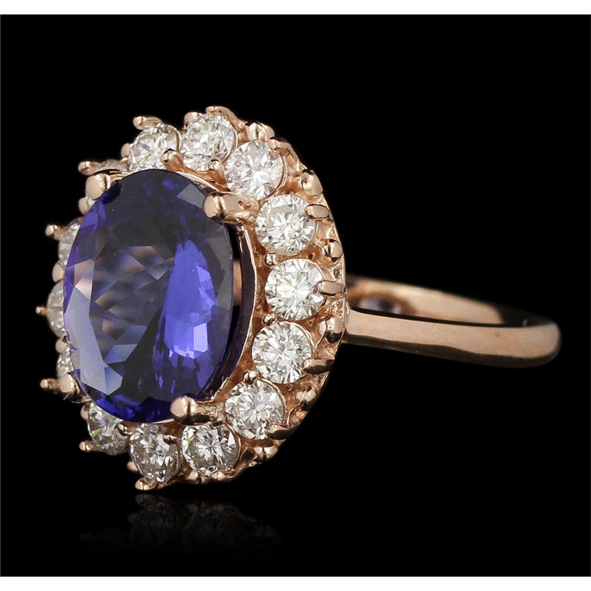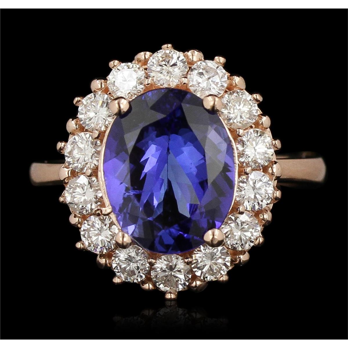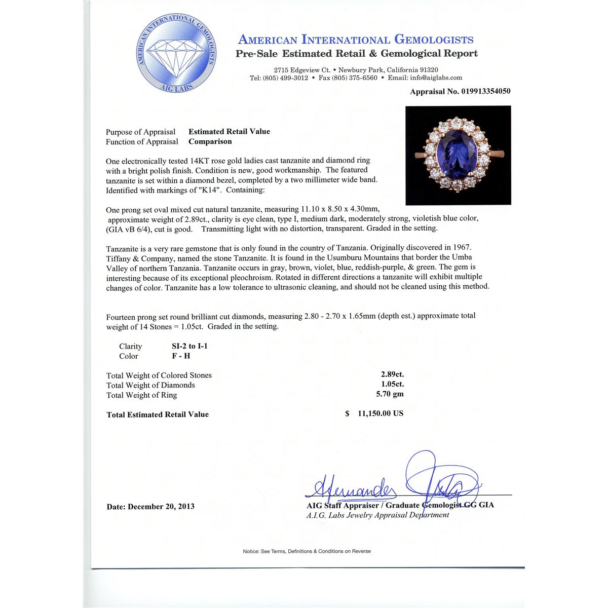 14KT rose gold 2.89ct Tanzanite and Diamond Ring A6669. One electronically tested 14KT rose gold ladies cast tanzanite and diamond ring with a bright polish finish. The featured tanzanite is set within a diamond bezel, completed by a two millimeter wide band. Identified with markings of "K14". Condition is new, good workmanship. Containing: One prong set oval mixed cut natural tanzanite, measuring 11.10 x 8.50 x 4.30mm, approximate weight of 2.89ct., clarity is eye clean, type I, medium dark, moderately strong, violetish blue color, (GIA vB 6/4), cut is good. Transmitting light with no distortion, transparent. Graded in the setting.Tanzanite is a very rare gemstone that is only found in the country of Tanzania. Originally discovered in 1967. Tiffany & Company, named the stone Tanzanite. It is found in the Usumburu Mountains that border the Umba Valley of northern Tanzania. Tanzanite occurs in gray, brown, violet, blue, reddish-purple, & green. The gem is interesting because of its exceptional pleochroism. Rotated in different directions a tanzanite will exhibit multiple changes of color. Tanzanite has a low tolerance to ultrasonic cleaning, and should not be cleaned using this method.Fourteen prong set round brilliant cut diamonds, measuring 2.80 - 2.70 x 1.65mm (depth est.) approximate. Total Weight of 14 Stones = 1.05ct. Graded in the setting. Clarity: SI-2 to I-1. Color: F - H. Total Weight of Colored Stones 2.89ct. Total Weight of Diamonds 1.05ct. AIG Appraised at $11,150.00.