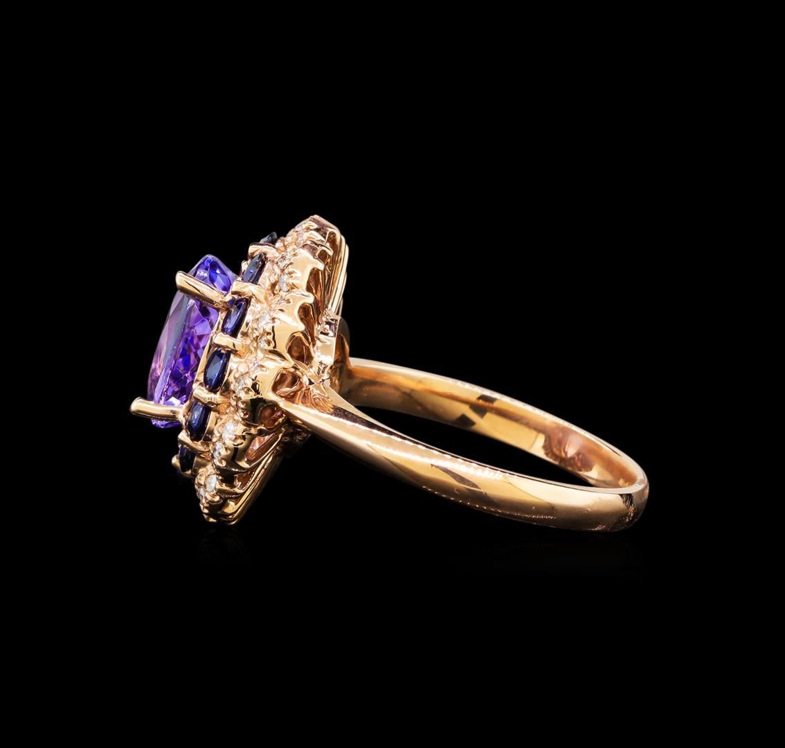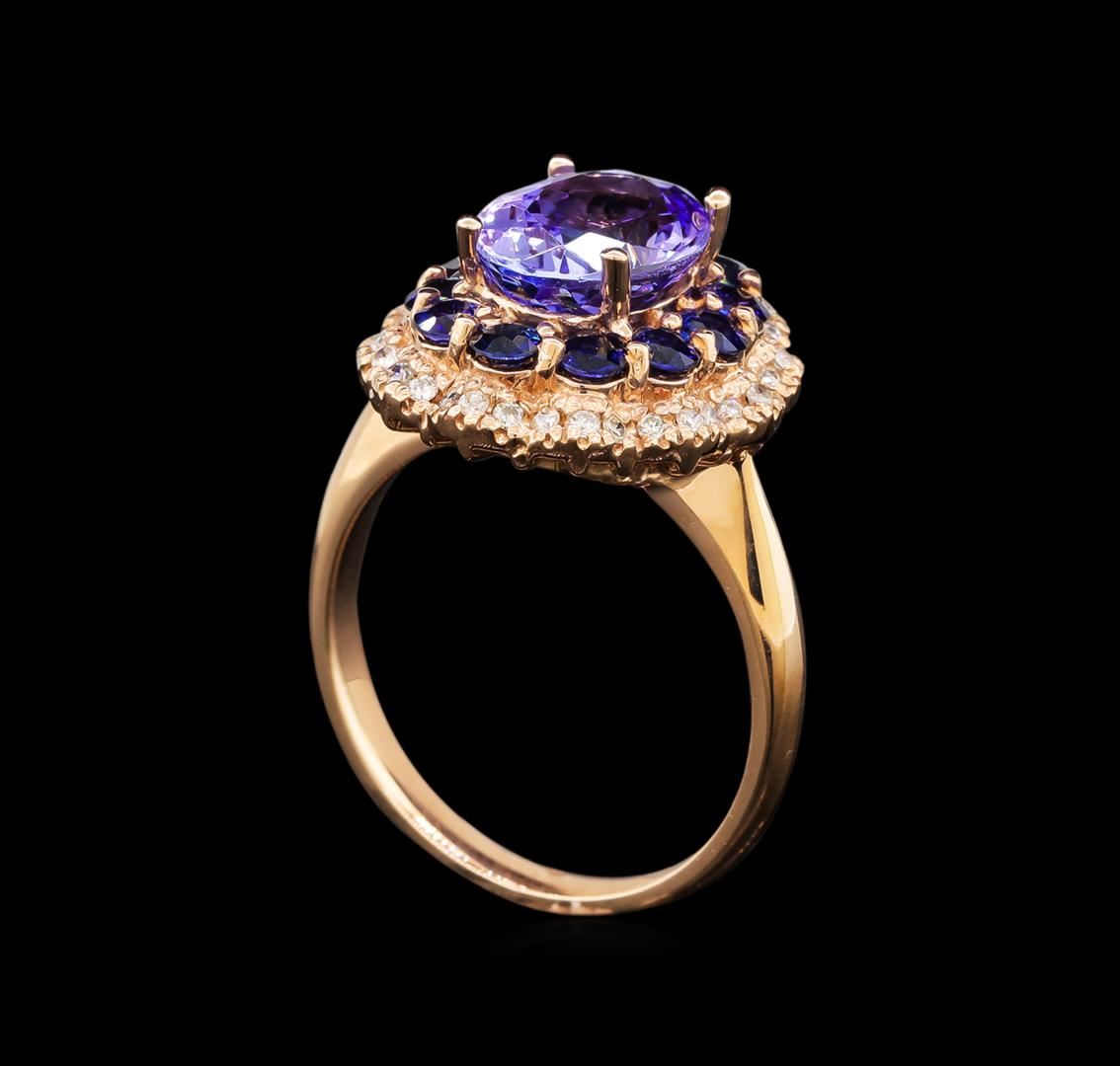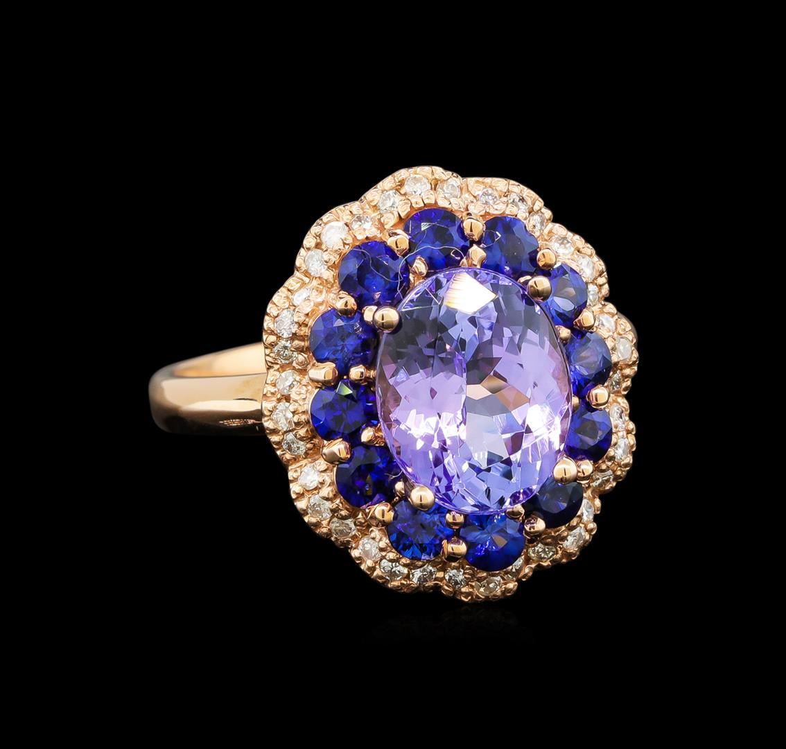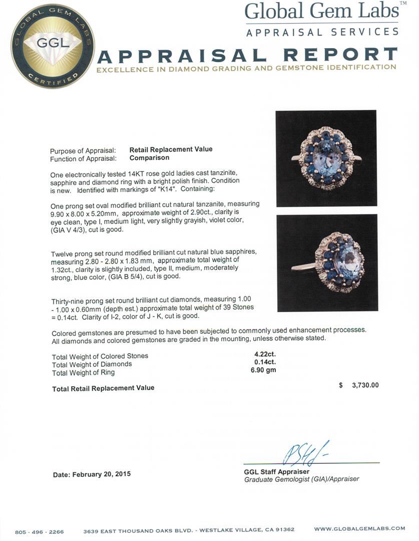 One electronically tested 14KT rose gold ladies cast tanzanite, sapphire and diamond ring with a bright polish finish. Identified with markings of "K14". Condition is new. Containing: One prong set oval modified brilliant cut natural tanzanite, measuring 9.90 x 8.00 x 5.20mm, approximate weight of 2.90ct., clarity is eye clean, type I, medium light, very slightly grayish, violet color, (GIA V 4/3), cut is good. Twelve prong set round modified brilliant cut natural blue sapphires, measuring 2.80 - 2.80 x 1.83 mm, approximate total weight of 1.32ct., clarity is slightly included, type II, medium, moderately strong, blue color, (GIA B 5/4), cut is good. Thirty-Nine prong set round brilliant cut diamonds, measuring 1.00 - 1.00 x 0.60mm (depth est.) approximate total weight of 39 Stones = 0.14ct. Clarity: I-2. Color: J - K, Cut is Good. Colored gemstones are presumed to have been subjected to commonly used enhancement processes. All diamonds and colored gemstones are graded in the mounting, unless otherwise stated. Total Weight of Colored Stones 4.22ct. Total Weight of Diamonds 0.14ct. Total Weight of Ring 6.90 grams. GGL Appraised at $3,730.00.