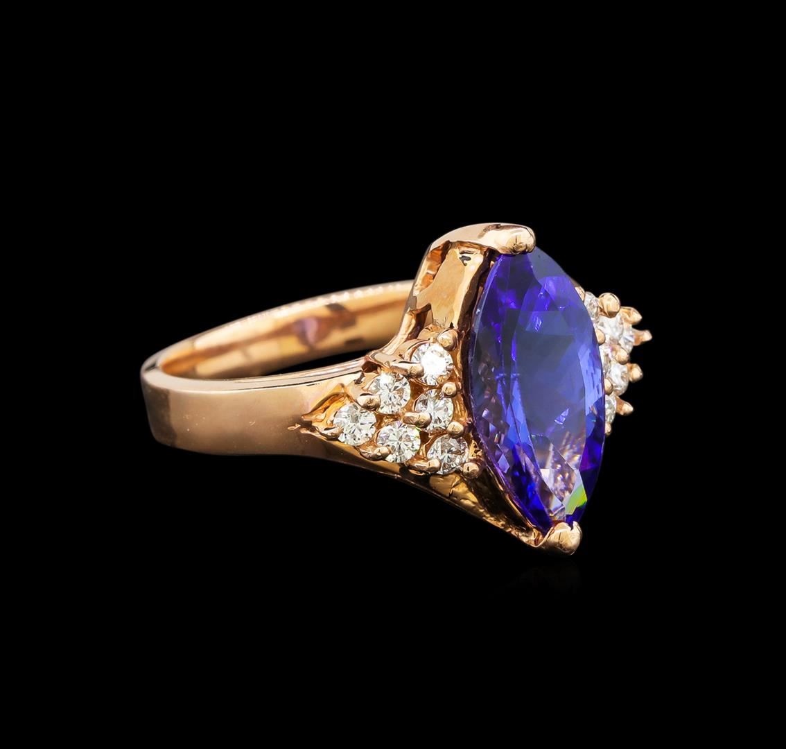 One electronically tested 14KT rose gold ladies cast tanzanite and diamond ring with a bright polish finish. Identified with markings of "K14". Condition is new. Containing: One prong set marquise modified brilliant cut natural tanzanite, measuring 13.50 x 7.20 x 4.68mm, approximate weight of 2.90ct., clarity is eye clean, type I, medium light, moderately strong, bluish violet color, (GIA bV 4/4), cut is good. Twelve prong set round brilliant cut diamonds, measuring 1.60 - 1.60 x 0.96mm (depth est.) approximate total weight of 12 Stones = 0.18ct. Clarity: SI-1 to SI-2. Color: K - L, Cut is Good. Colored gemstones are presumed to have been subjected to commonly used enhancement processes. All diamonds and colored gemstones are graded in the mounting, unless otherwise stated. Total Weight of Colored Stones 2.90ct. Total Weight of Diamonds 0.18ct. Total Weight of Ring 5.40 grams. GGL Appraised at $3,730.00.
