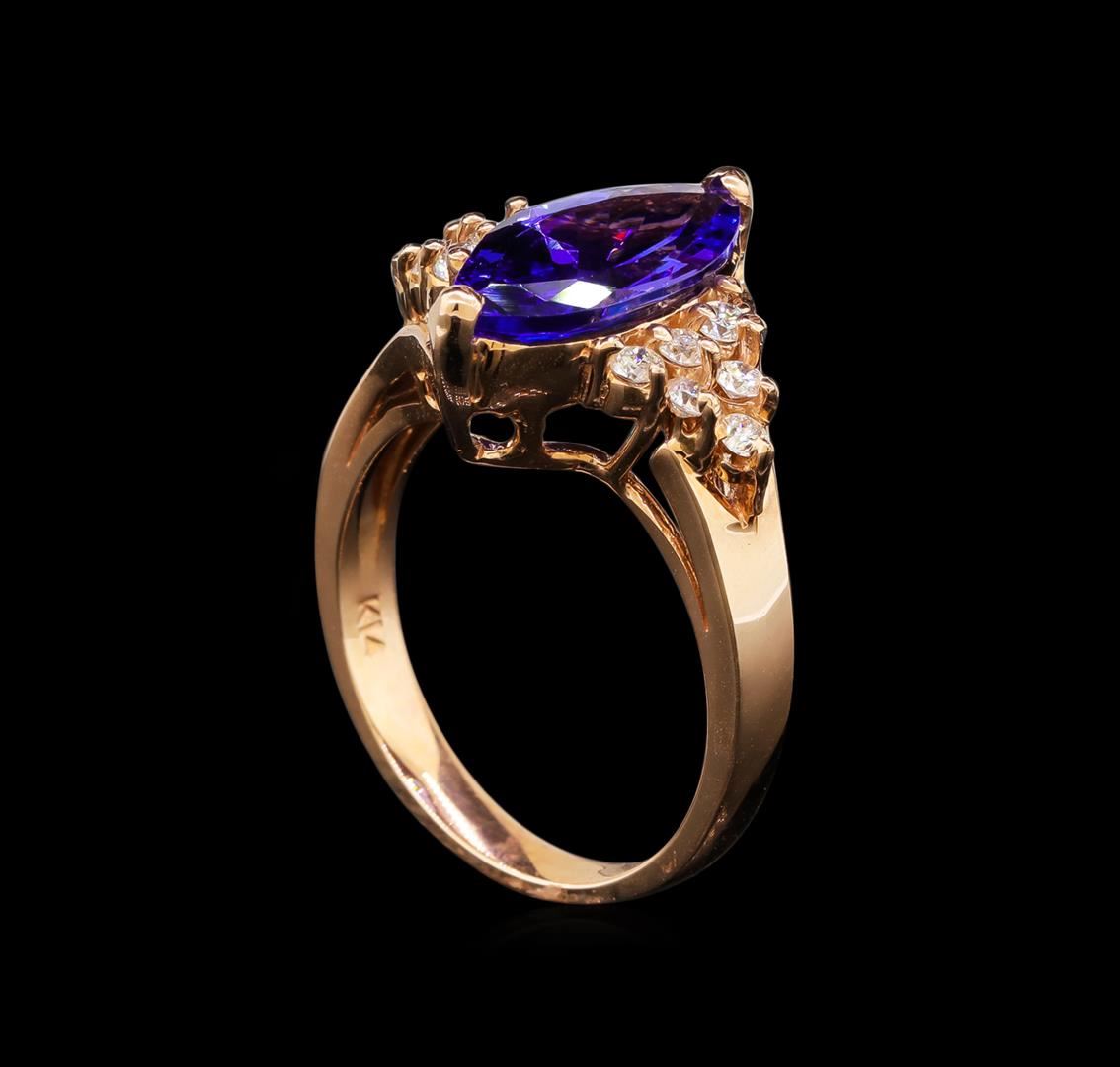 One electronically tested 14KT rose gold ladies cast tanzanite and diamond ring with a bright polish finish. Identified with markings of "K14". Condition is new. Containing: One prong set marquise modified brilliant cut natural tanzanite, measuring 13.50 x 7.20 x 4.68mm, approximate weight of 2.90ct., clarity is eye clean, type I, medium light, moderately strong, bluish violet color, (GIA bV 4/4), cut is good. Twelve prong set round brilliant cut diamonds, measuring 1.60 - 1.60 x 0.96mm (depth est.) approximate total weight of 12 Stones = 0.18ct. Clarity: SI-1 to SI-2. Color: K - L, Cut is Good. Colored gemstones are presumed to have been subjected to commonly used enhancement processes. All diamonds and colored gemstones are graded in the mounting, unless otherwise stated. Total Weight of Colored Stones 2.90ct. Total Weight of Diamonds 0.18ct. Total Weight of Ring 5.40 grams. GGL Appraised at $3,730.00.