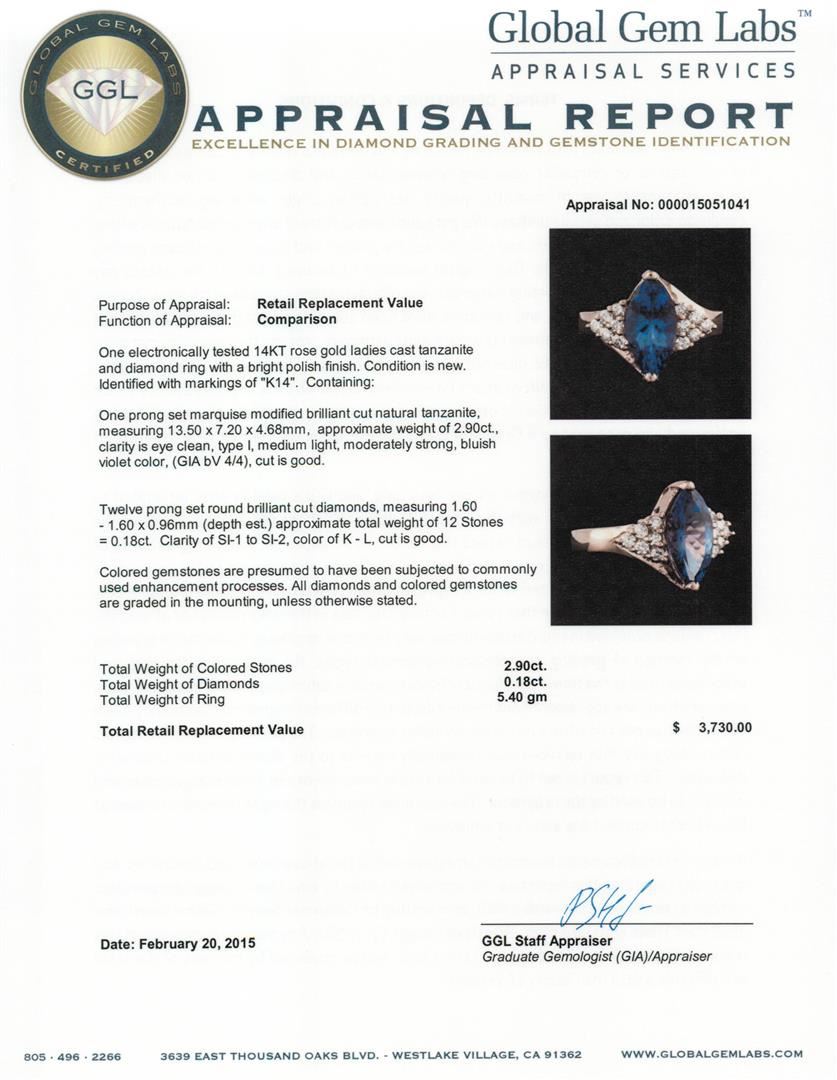 One electronically tested 14KT rose gold ladies cast tanzanite and diamond ring with a bright polish finish. Identified with markings of "K14". Condition is new. Containing: One prong set marquise modified brilliant cut natural tanzanite, measuring 13.50 x 7.20 x 4.68mm, approximate weight of 2.90ct., clarity is eye clean, type I, medium light, moderately strong, bluish violet color, (GIA bV 4/4), cut is good. Twelve prong set round brilliant cut diamonds, measuring 1.60 - 1.60 x 0.96mm (depth est.) approximate total weight of 12 Stones = 0.18ct. Clarity: SI-1 to SI-2. Color: K - L, Cut is Good. Colored gemstones are presumed to have been subjected to commonly used enhancement processes. All diamonds and colored gemstones are graded in the mounting, unless otherwise stated. Total Weight of Colored Stones 2.90ct. Total Weight of Diamonds 0.18ct. Total Weight of Ring 5.40 grams. GGL Appraised at $3,730.00.