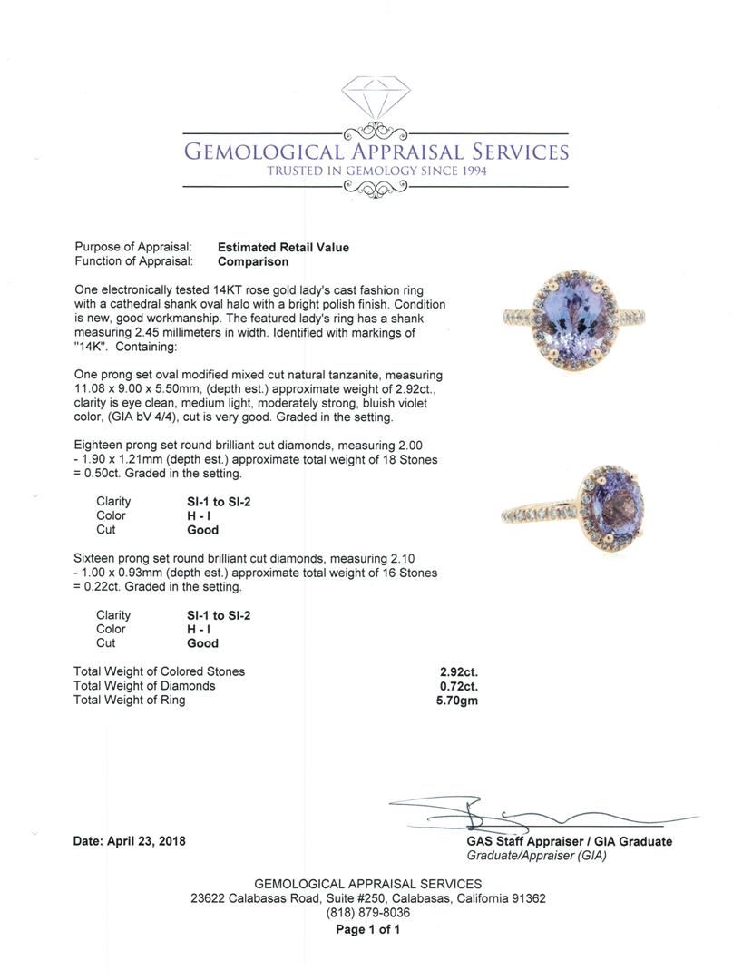 One electronically tested 14KT rose gold Ladies cast fashion ring with a cathedral shank oval halo with a bright polish finish. The featured Ladies ring has a shank measuring 2.45 millimeters in width. Identified with markings of '14K'. Condition is new, good workmanship. Containing: One prong set oval modified mixed cut natural tanzanite, measuring 11.08 x 9.00 x 5.50mm, (depth est.) approximate weight of 2.92ct., clarity is eye clean, medium light, moderately strong, bluish violet color, (GIA bV 4/4), cut is very good. Graded in the setting. Eighteen prong set round brilliant cut diamonds, measuring 2.00 - 1.90 x 1.21mm (depth est.) approximate total weight of 18 Stones = 0.50ct. Graded in the setting. Color H - I Clarity SI-1 to SI-2 Cut Good Sixteen prong set round brilliant cut diamonds, measuring 2.10 - 1.00 x 0.93mm (depth est.) approximate total weight of 16 Stones = 0.22ct. Graded in the setting. Color H - I Clarity SI-1 to SI-2 Cut Good. Total Weight of Colored Stones 2.92ct.. Total Weight of Diamonds 0.72ct.. Total Weight of Ring 5.70gm. GAS Appraised.