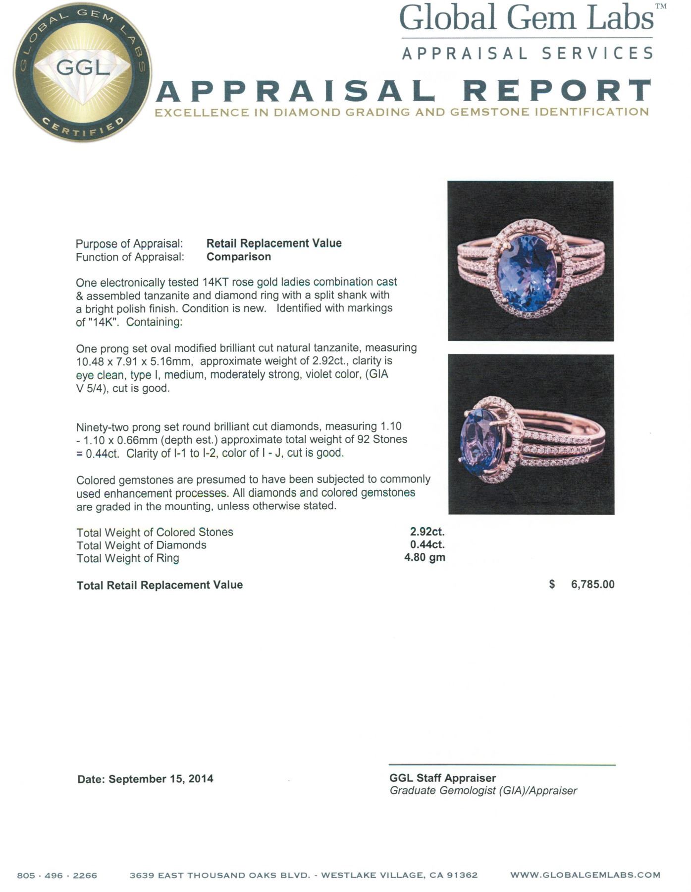 One electronically tested 14KT rose gold ladies combination cast & assembled tanzanite and diamond ring with a split shank with a bright polish finish. Identified with markings of "14K". Condition is new. Containing: One prong set oval modified brilliant cut natural tanzanite, measuring 10.48 x 7.91 x 5.16mm, approximate weight of 2.92ct., clarity is eye clean, type I, medium, moderately strong, violet color, (GIA V 5/4), cut is good. Ninety-Two prong set round brilliant cut diamonds, measuring 1.10 - 1.10 x 0.66mm (depth est.) approximate total weight of 92 Stones = 0.44ct. Clarity: I-1 to I-2. Color: I - J, Cut is Good. Colored gemstones are presumed to have been subjected to commonly used enhancement processes. All diamonds and colored gemstones are graded in the mounting, unless otherwise stated total weight of Colored Stones 2.92ct. Total Weight of Diamonds 0.44ct. Total Weight of Ring 4.80 grams. GGL Appraised.