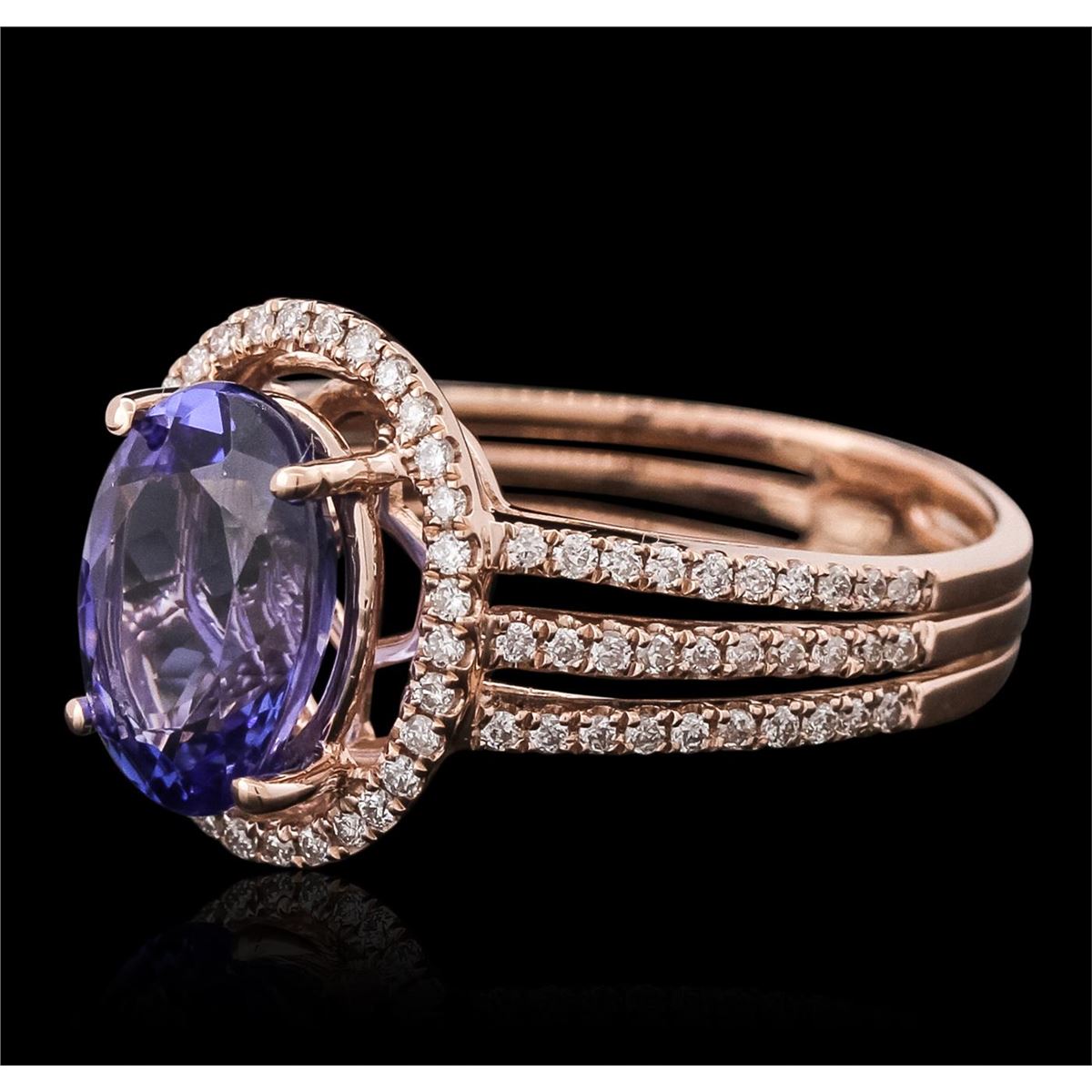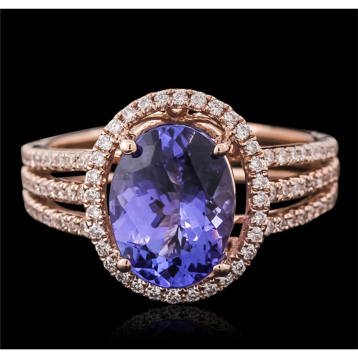 One electronically tested 14KT rose gold ladies combination cast & assembled tanzanite and diamond ring with a split shank with a bright polish finish. Identified with markings of "14K". Condition is new. Containing: One prong set oval modified brilliant cut natural tanzanite, measuring 10.48 x 7.91 x 5.16mm, approximate weight of 2.92ct., clarity is eye clean, type I, medium, moderately strong, violet color, (GIA V 5/4), cut is good. Ninety-Two prong set round brilliant cut diamonds, measuring 1.10 - 1.10 x 0.66mm (depth est.) approximate total weight of 92 Stones = 0.44ct. Clarity: I-1 to I-2. Color: I - J, Cut is Good. Colored gemstones are presumed to have been subjected to commonly used enhancement processes. All diamonds and colored gemstones are graded in the mounting, unless otherwise stated total weight of Colored Stones 2.92ct. Total Weight of Diamonds 0.44ct. Total Weight of Ring 4.80 grams. GGL Appraised at $6,785.00.