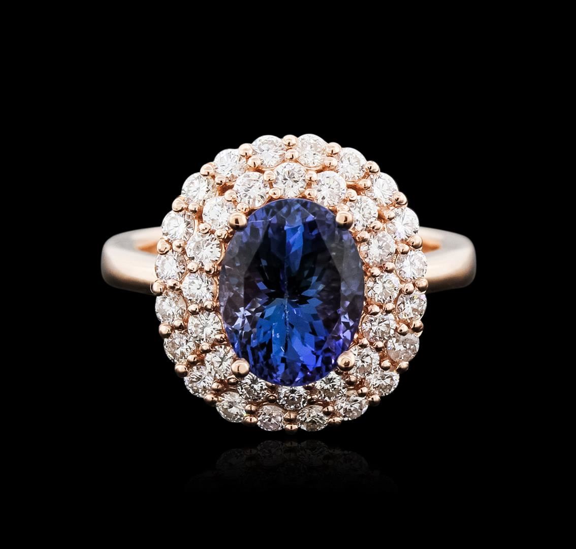 One electronically tested Gold-Rose-14KT ladies cast tanzanite and diamond ring with a bright polish finish. Identified with markings of "14K". Condition is new. Containing: One prong set oval modified brilliant cut natural tanzanite, measuring 10.00. x 8.00. x 5.21mm, approximate weight of 2.93ct., clarity is eye clean, type I, medium light, very slightly grayish, violet color, (GIA V 4/3), cut is good. Thirty-Six prong set round brilliant cut diamonds, measuring 1.80 - 1.80 x 1.08mm (depth est.) approximate total weight of 36 Stones = 0.77ct. Clarity: SI-1 to SI-2. Color: J - K. Colored gemstones are presumed to have been subjected to commonly used enhancement processes. All diamonds and colored gemstones are graded in the mounting, unless otherwise stated. Total Weight of Colored Stones 2.93ct. Total Weight of Diamonds 0.77ct. Total Weight of Ring 6.30 grams. GGL Appraised at $5,090.00.