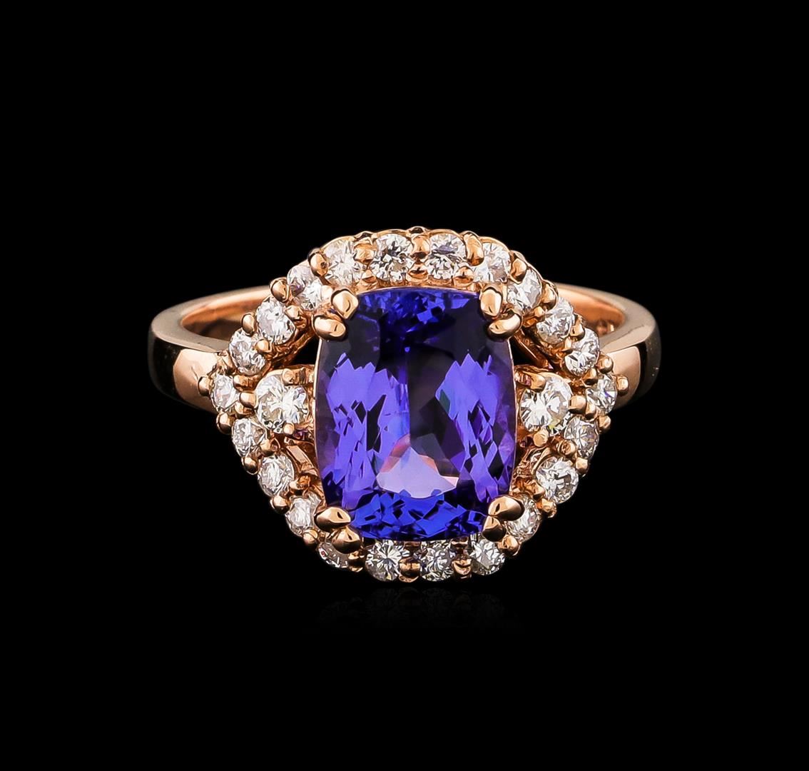 One electronically tested 14KT rose gold ladies combination cast & assembled ring with a bright polish finish. Condition is new. Identified with markings of "K14". Containing: Twenty-Four prong set round brilliant cut diamonds, measuring 2.20 - 1.70 x 1.17mm (depth est.) approximate. Total Weight of 24 Stones = 0.35ct. Clarity: SI-1 to SI-2. Color: I - J, Cut is Good. One prong set rectangular cushion modified brilliant cut natural tanzanite, measuring 9.85 x 7.60 x 5.00mm, approximate weight of 2.95ct., clarity is eye clean, type I, medium, very slightly grayish, bluish violet color, (GIA bV 5/3), cut is good. Colored gemstones are presumed to have been subjected to commonly used enhancement processes. All diamonds and colored gemstones are graded in the mounting, unless otherwise stated. Total Weight of Colored Stones 2.95ct. Total Weight of Diamonds 0.35ct. Total Weight of Ring 5.30 grams. GGL Appraised at $7,265.00.
