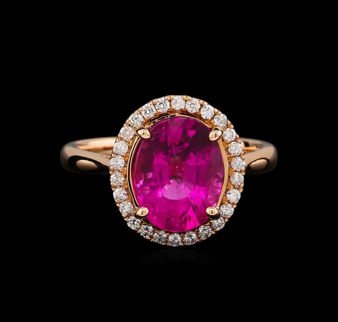 One electronically tested 14KT rose gold ladies cast tourmaline and diamond ring with a bright polish finish. Condition is new, good workmanship. The featured tourmaline is set within a diamond bezel supported by tapering shoulders, completed by a two and one-half millimeter wide band. Identified with markings of "14K". Containing: One prong set oval mixed cut natural pink tourmaline, measuring 10.60 x 8.10 x 5.25mm, 5%. bulge factor, approximate weight of 2.95ct., type II Clarity is moderately included, medium dark, very slightly brownish, purplish pink color, (GIA pPi 6/3), cut is good. Naturally occurring internal & external characteristics are present. Graded in the setting. Twenty-Six prong set round brilliant cut diamonds, measuring 1.50 - 1.40 x 0.87mm (depth est.) approximate. Total Weight of 26 Stones = 0.39ct. Graded in the setting. Clarity: SI-1 to I-1. Color: G - I. Total Weight of Colored Stones 2.95ct. Total Weight of Diamonds 0.39ct. Total Weight of Ring 4.09grams. AIG Appraised at $2,830.00.
