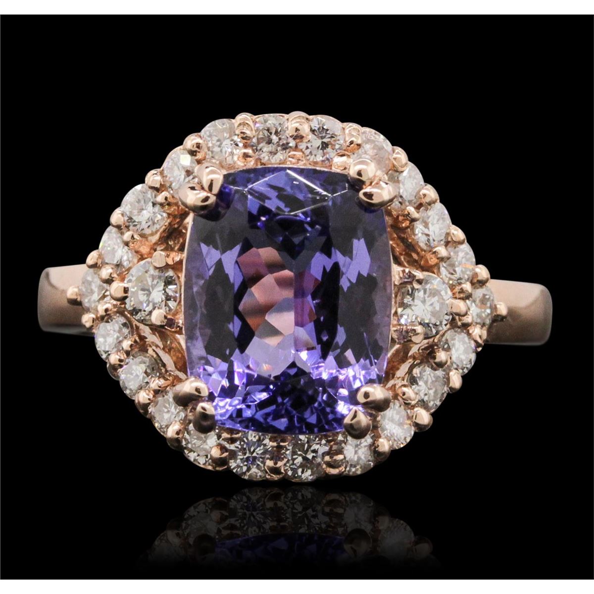 One electronically tested 14KT rose gold ladies combination cast & assembled ring with a bright polish finish. Condition is new. Identified with markings of "K14". Containing: Twenty-Four prong set round brilliant cut diamonds, measuring 2.20 - 1.70 x 1.17mm (depth est.) approximate. Total Weight of 24 Stones = 0.35ct. Clarity: SI-1 to SI-2. Color: I - J, Cut is Good. One prong set rectangular cushion modified brilliant cut natural tanzanite, measuring 9.85 x 7.60 x 5.00mm, approximate weight of 2.95ct., clarity is eye clean, type I, medium, very slightly grayish, bluish violet color, (GIA bV 5/3), cut is good. Colored gemstones are presumed to have been subjected to commonly used enhancement processes. All diamonds and colored gemstones are graded in the mounting, unless otherwise stated. Total Weight of Colored Stones 2.95ct. Total Weight of Diamonds 0.35ct. Total Weight of Ring 5.30 grams. GGL Appraised at $7,265.00.