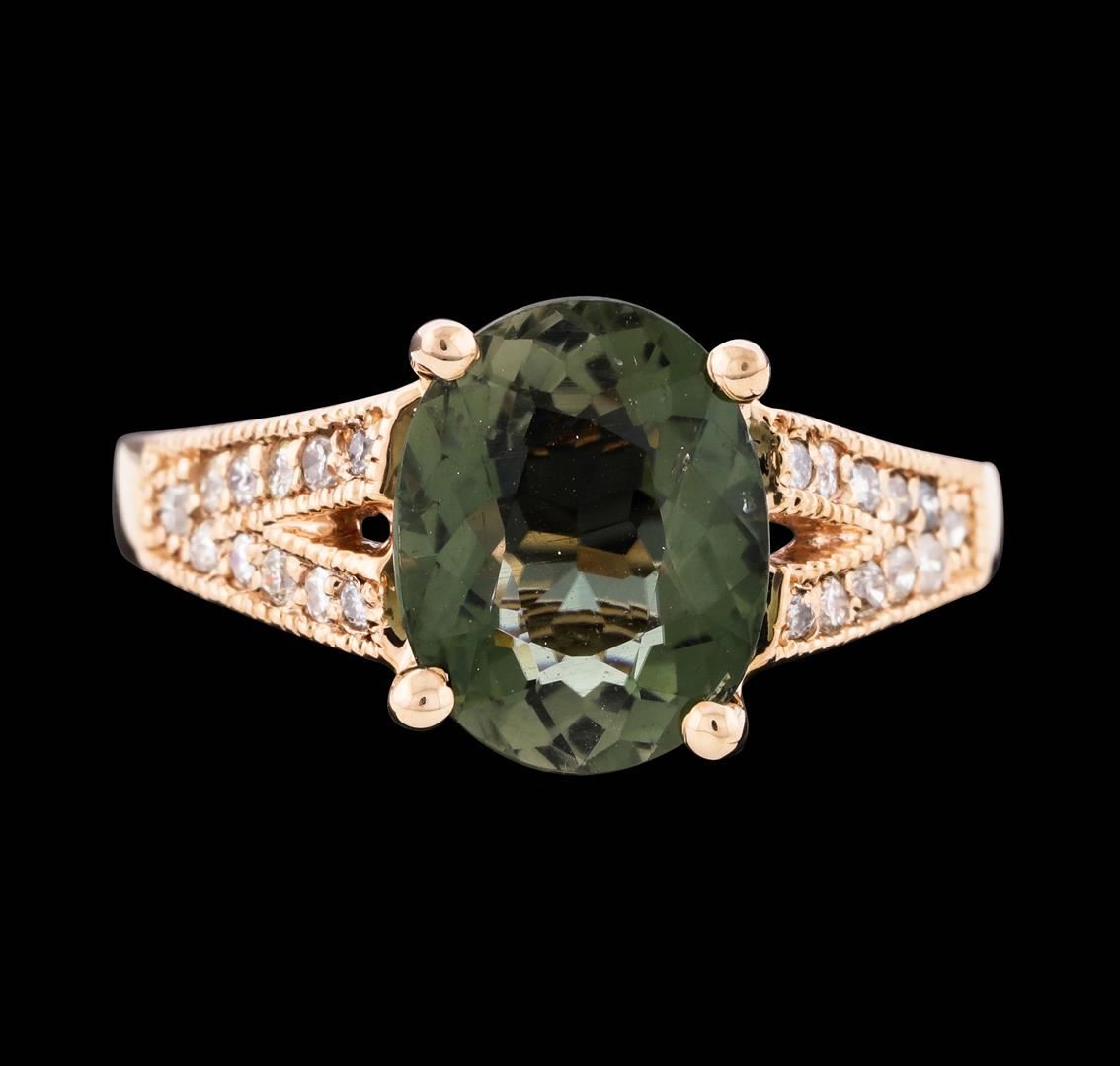 One electronically tested 14KT rose gold lady's cast fashion ring with a split cathedral shank with a bright polish with milgrain detailing finish. The featured lady's ring has a shank measuring 1.91 millimeters wide. Identified with markings of "14K". Condition is new, good workmanship. Containing: One prong set oval modified brilliant cut natural green tourmaline, measuring 10.70 x 8.40 x 4.96mm, (depth est.) approximate weight of 2.97ct., clarity is slightly included, medium light, moderately strong, slightly yellowish green color, (GIA slyG 4/4), cut is good. Transmitting light with a minimum of distortion, transparent. Colored gemstones are presumed to have been subjected to commonly used enhancement processes. Graded in the setting. Twenty-Two prong set round brilliant cut diamonds, measuring 1.40 - 1.35 x 0.86mm (depth est.) approximate total weight of 22 Stones = 0.23ct. Graded in the setting. Clarity: SI-2 to I-1. Color: I - JCut Good. Total Weight of Colored Stones 2.97ct. Total Weight of Diamonds 0.23ct. Total Weight of Ring 4.90gm. GAS Appraised.