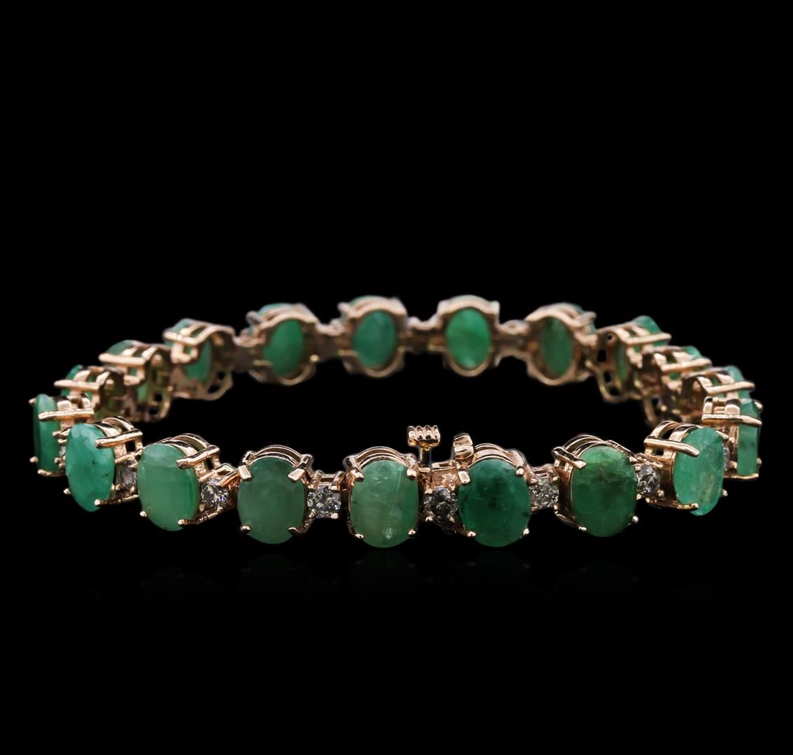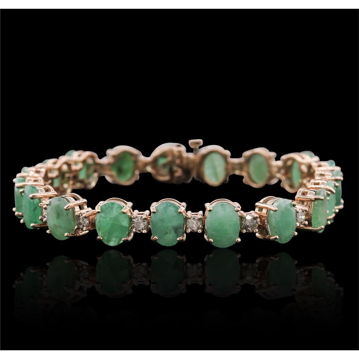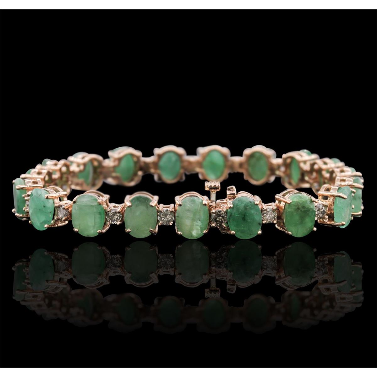 One electronically tested 14KT rose gold ladies cast & assembled emerald and diamond bracelet with a bright polish finish. Condition is new, good workmanship. Seven inch length bracelet features a flexible ribbon of emeralds alternated by diamonds terminating in a concealed clasp with safety bar. Identified with markings of "14K". Containing: Nineteen prong set oval mixed cut natural emeralds, measuring 8.00 x 6.00 x 3.90mm, 6%. bulge factor, approximate. Total Weight of 20.90ct., clarity is severely included, type III, medium, very slightly grayish, very slightly bluish green color, (GIA vslbG 5/3), cut is good. Transmitting light somewhat diffusely, translucent. Naturally occurring internal & external characteristics are present. Indications of oil residue. Measurements & the color grade are an average for the group. Graded in the setting. Nineteen prong set round brilliant cut diamonds, measuring 2.80 - 2.70 x 1.65mm (depth est.) approximate. Total Weight of 19 Stones = 1.54ct. Color grade is an average for the group. Graded in the setting. Clarity: I-1 to I-2. Total Weight of Colored Stones 20.90ct. Total Weight of Diamonds 1.54ct. Total Weight of Bracelet 20.40 grams. AIG Appraised at $9,950.00.