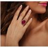 One electronically tested 14KT rose gold Ladies combination cast & assembled cocktail ring with a bright polish finish. Identified with markings of "14K". Condition is excellent. Containing: One prong set oval modified brilliant cut natural ruby, measuring 19.50 x 14.40 x 7.70mm, approximate weight of 21.26ct., clarity is heavily included, type II, medium dark, moderately strong, slightly purplish red color, (GIA slpR 6/4), cut is good. Indications of heat treatment with glass and flux residue. Colored gemstones are presumed to have been subjected to commonly used and possible undetectable color/clarity enhancement processes. Sixty-Eight prong set round brilliant cut diamonds, measuring 1.50 - 1.40 x 0.87mm (depth est.) approximate total weight of 68 Stones = 1.01ct. Clarity of I-1 to I-2, Color of H - I. Total Weight of Colored Stones 21.26ct. Total Weight of Diamonds 1.01ct. Total Weight of Ring 10.70gm. GGL Appraised at $10,305.00.