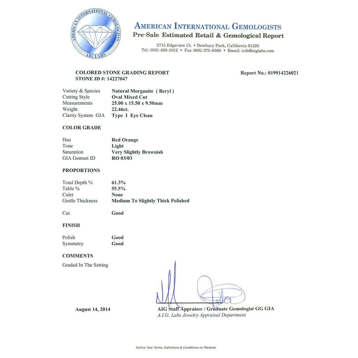 One electronically tested 14KT rose gold ladies cast morganite and diamond ring with a bright polish finish. Condition is new, good workmanship. The featured morganite is set within two tiered diamond bezels, completed by a three and one-half millimeter wide band. Identified with markings of "K14". Containing: One prong set oval mixed cut natural morganite, measuring 25.00 x 15.50 x 9.50mm, 6%. bulge factor, approximate weight of 22.46ct., clarity is eye clean, type I, light, very slightly brownish, red orange color, (GIA RO 3/3), cut is good. Transmitting light with no distortion, transparent. Colored Stone Grading Report attached. Graded in the setting. Sixty prong set round brilliant cut diamonds, measuring 2.80 - 2.30 x 1.53mm (depth est.) approximate. Total Weight of 60 Stones = 3.73ct. Graded in the setting. Clarity: SI-1 to I-1. Color: G - I. Total Weight of Colored Stones 22.46ct. Total Weight of Diamonds 3.73ct. Total Weight of Ring 20.33gm. AIG Appraised at $31,190.00.