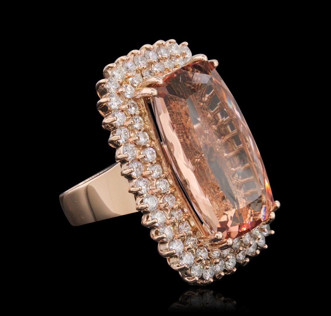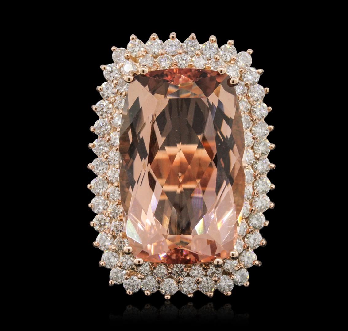 One electronically tested 14KT rose gold ladies combination cast & assembled ring with a bright polish finish. Condition is new. Identified with markings of "K14". Containing: One prong set rectangular cushion modified brilliant cut natural morganite, measuring 25.12 x 16.20 x 9.58mm, approximate weight of 24.92ct., clarity is eye clean, type I, light, brownish, reddish orange color, (GIA rO 3/1), cut is good. Seventy-Two prong set round brilliant cut diamonds, measuring 2.20 - 1.90 x 1.23mm (depth est.) approximate. Total Weight of 72 Stones = 2.27ct. Clarity: SI-1 to SI-2. Color: K - L, Cut is Good. Colored gemstones are presumed to have been subjected to commonly used enhancement processes. All diamonds and colored gemstones are graded in the mounting, unless otherwise stated. Total Weight of Colored Stones 24.92ct. Total Weight of Diamonds 2.27ct. Total Weight of Ring 25.10 grams. GGL Appraised at $25,795.00.