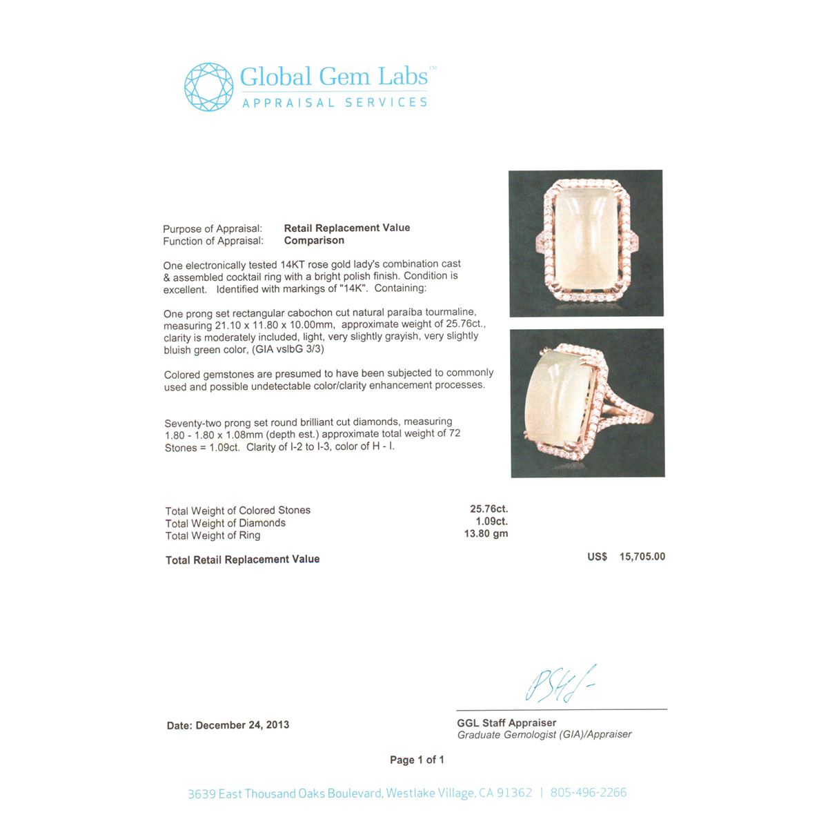 One electronically tested 14KT rose gold Ladies combination cast & assembled cocktail ring with a bright polish finish. Identified with markings of "14K". Condition is excellent. Containing: One prong set rectangular cabochon cut natural Paraiba tourmaline, measuring 21.10 x 11.80 x 10.00mm, approximate weight of 25.76ct., clarity is moderately included, light, very slightly grayish, very slightly bluish green color, (GIA vslbG 3/3). Colored gemstones are presumed to have been subjected to commonly used and possible undetectable color/clarity enhancement processes. Seventy-Two prong set round brilliant cut diamonds, measuring 1.80 - 1.80 x 1.08mm (depth est.) approximate total weight of 72 Stones = 1.09ct. Clarity of I-2 to I-3, Color of H - I. Total Weight of Colored Stones 25.76ct. Total Weight of Diamonds 1.09ct. Total Weight of Ring 13.80gm. GGL Appraised at $15,705.00.