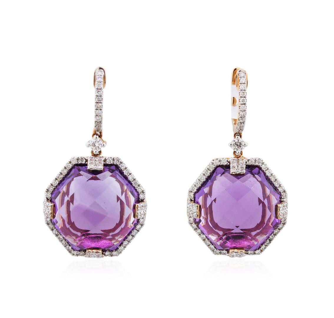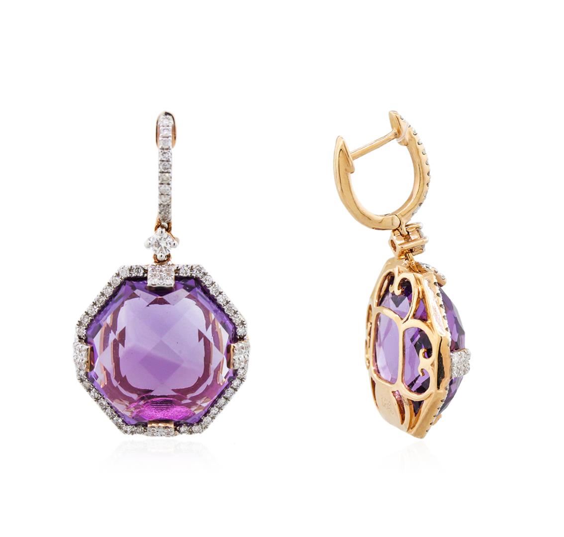 One pair of earrings featuring: 14KT rose gold with a total weight of 6.90 grams, (2) amethysts with a total weight of 27.52ctw, and (136) diamonds with a total weight of 0.86ctw.