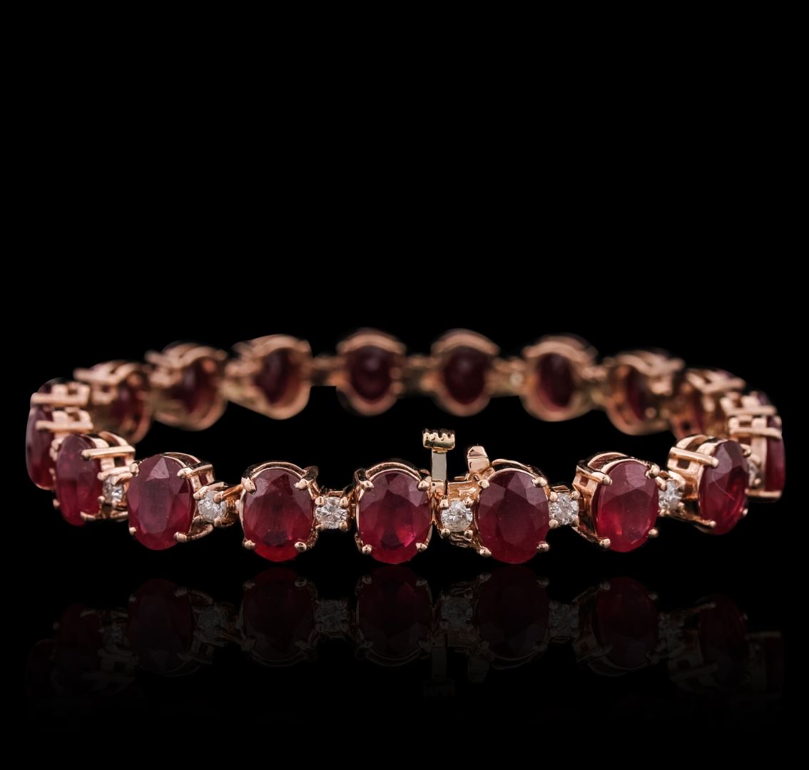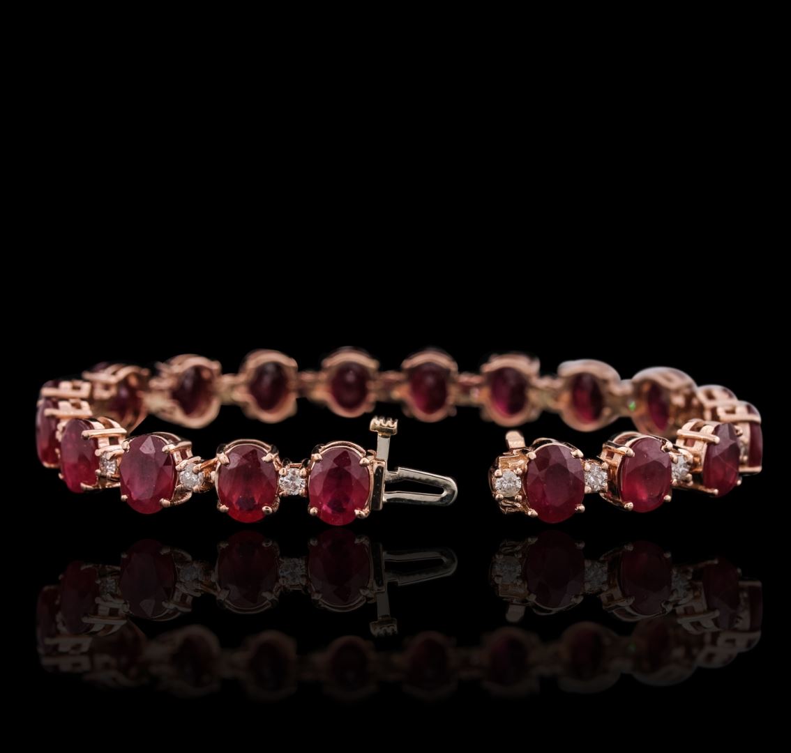 One electronically tested 14KT rose gold ladies combination cast & assembled bracelet with a hidden box clasp with a bright polish finish. Measurements: 6.85" in length. Identified with markings of "14K". Condition is new. Containing: Nineteen prong set oval modified brilliant cut natural rubies, measuring 8.00 x 6.00 x 3.75mm, approximate total weight of 28.72ct., clarity is heavily included, medium dark, moderately strong, strongly purplish red color, (GIA stpR 6/4), cut is good. Nineteen prong set round brilliant cut diamonds, measuring 2.50 - 2.50 x 1.50mm (depth est.) approximate total weight of 19 Stones = 1.09ct. Clarity: I-1 to I-2. Color: K - L, Cut is Good. Colored gemstones are presumed to have been subjected to commonly used enhancement processes. All diamonds and colored gemstones are graded in the mounting, unless otherwise stated. Total Weight of Colored Stones 28.72ct. Total Weight of Diamonds 1.09ct. Total Weight of Bracelet 22.70 grams. GGL Appraised at $14,120.00.