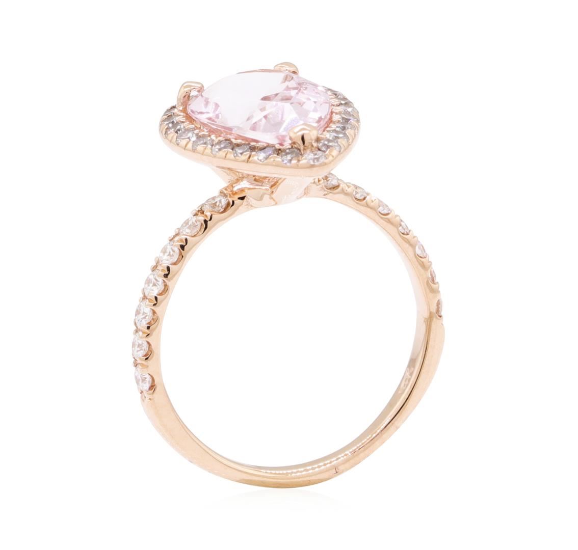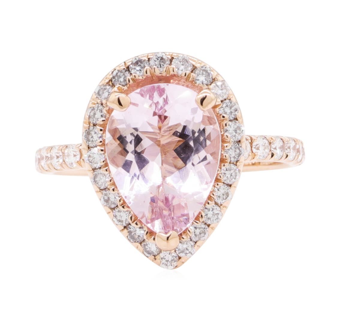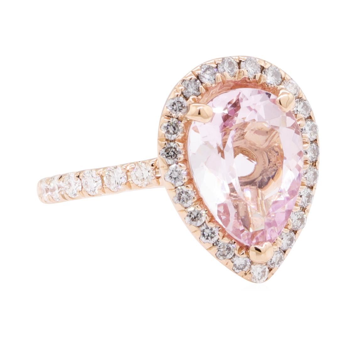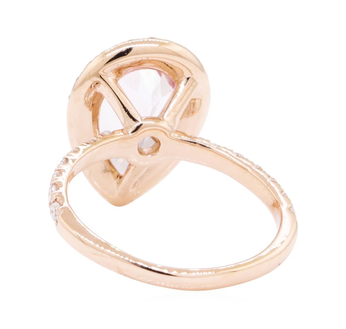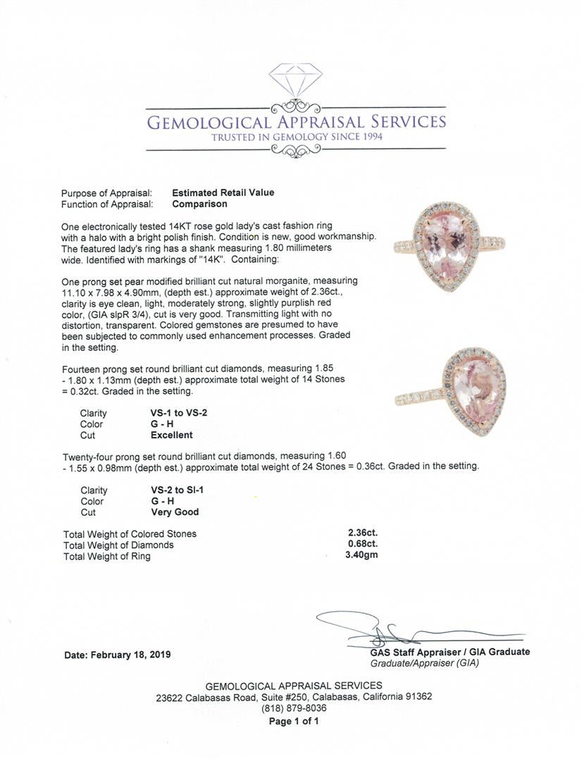One electronically tested 14KT rose gold lady's cast fashion ring with a halo with a bright polish finish. The featured lady's ring has a shank measuring 1.80 millimeters wide. Identified with markings of '14K'. Condition is new, good workmanship. Containing: One prong set pear modified brilliant cut natural morganite, measuring 11.10 x 7.98 x 4.90mm, (depth est.) approximate weight of 2.36ct.,, Clarity is eye clean, light, moderately strong, slightly purplish red color, (GIA slpR 3/4), cut is very good. Transmitting light with no distortion, transparent. Colored gemstones are presumed to have been subjected to commonly used enhancement processes. Graded in the setting. Fourteen prong set round brilliant cut diamonds, measuring 1.85 - 1.80 x 1.13mm (depth est.) approximate total weight of 14 Stones = 0.32ct. Graded in the setting. Color G - H, Clarity VS-1 to VS-2 Cut Excellent Twenty-Four prong set round brilliant cut diamonds, measuring 1.60 - 1.55 x 0.98mm (depth est.) approximate total weight of 24 Stones = 0.36ct. Graded in the setting. Color G - H, Clarity VS-2 to SI-1, Cut Very Good. Total Weight of Colored Stones 2.36ct. Total Weight of Diamonds 0.68ct. Total Weight of Ring 3.40gm. GAS Appraised.