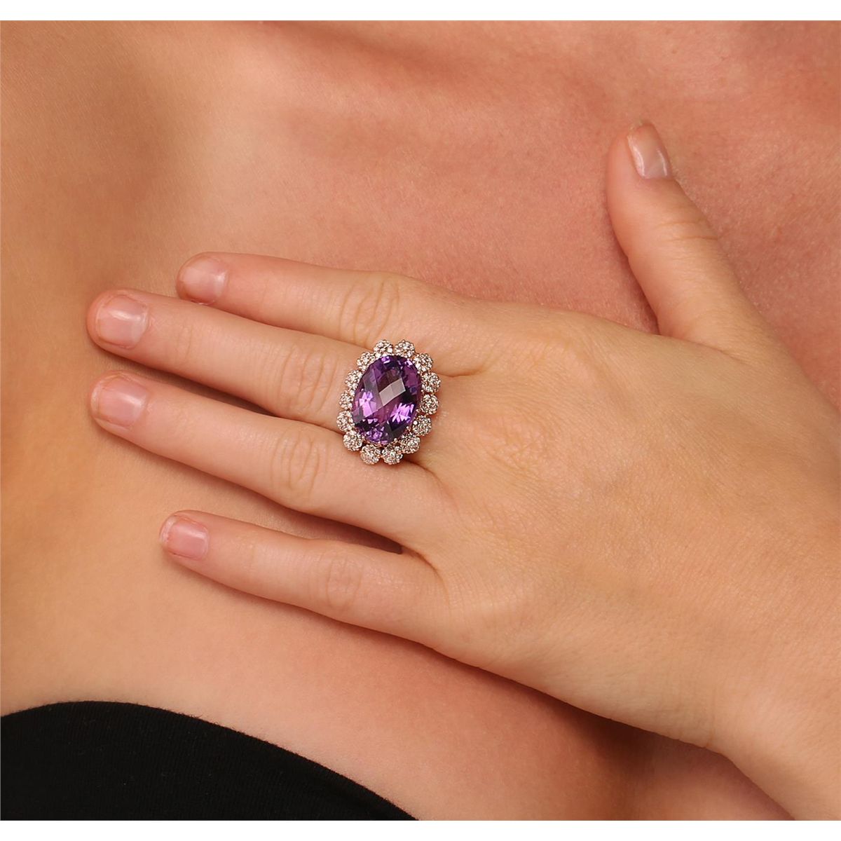 One electronically tested 14KT rose gold ladies combination cast & assembled ring with a bright polish finish. Identified with markings of "14K". Condition is new. Containing: One prong set fancy cut natural amethyst, measuring 17.80 x 13.00 x 10.04mm, approximate weight of 3.04ct., clarity is eye clean, type II, medium, very slightly grayish, purple color, (GIA P 5/3), cut is good. Ninety-Eight prong set round brilliant cut diamonds, measuring 1.30 - 1.30 x 0.78mm (depth est.) approximate total weight of 98 Stones = 0.78ct. Clarity: SI-2 to I-1, Cut is Good. Colored gemstones are presumed to have been subjected to commonly used enhancement processes. All diamonds and colored gemstones are graded in the mounting, unless otherwise stated. Total Weight of Colored Stones 3.04ct. Total Weight of Diamonds 0.78ct. Total Weight of Ring 8.50 grams. GGL Appraised at $5,530.00.
