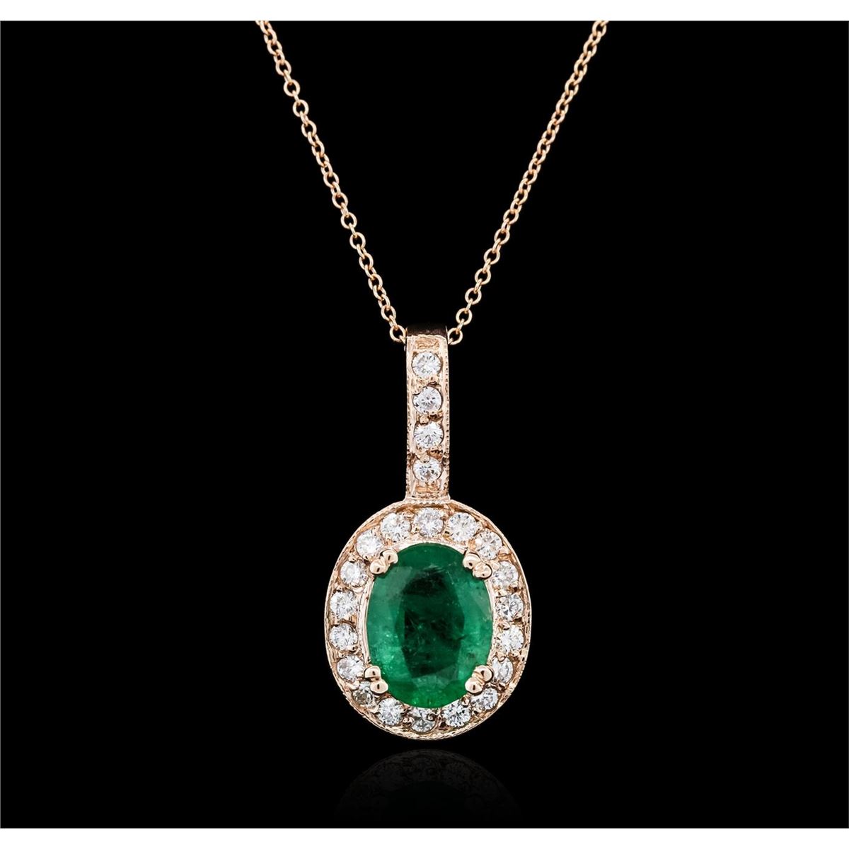 One pendant with chain featuring: 14KT rose gold weighing 5.30 grams containing one emerald with a total weight of 3.05ct and round diamonds with a total weight of 0.53cts.
