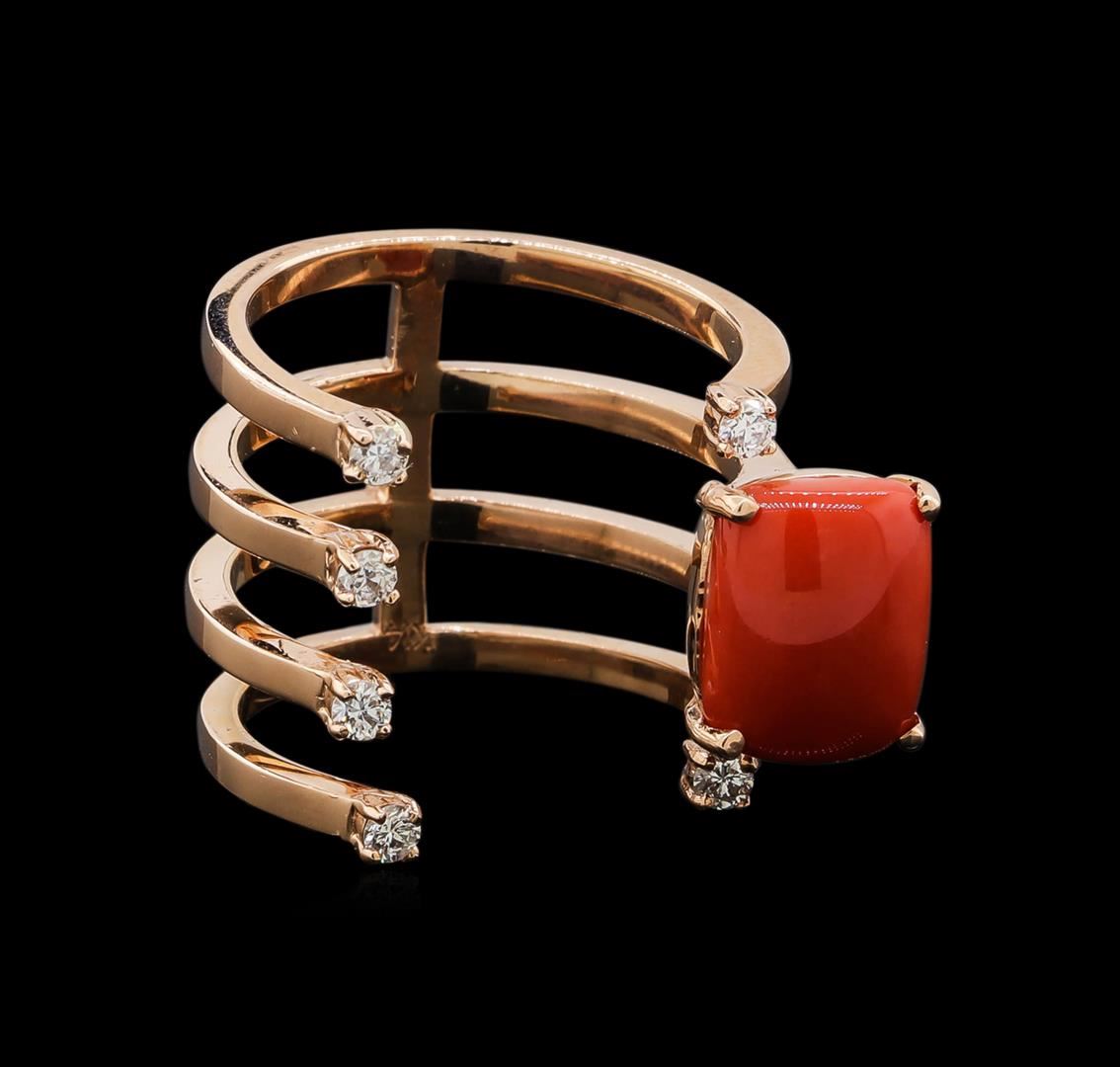 One electronically tested 14KT rose gold ladies cast coral and diamond ring with a bright polish finish. Identified with markings of "K14". Condition is new. Containing: One prong set oval cabochon cut natural pink coral, measuring 10.00 x 8.00 x 5.20mm, approximate weight of 3.06ct., clarity is heavily included, medium light, very slightly grayish, pink color, (GIA Pk 4/3), cut is good. Six prong set round brilliant cut diamonds, measuring 2.00 - 2.00 x 1.20mm (depth est.) approximate total weight of 6 Stones = 0.18ct. Clarity: SI-1 to I-1. Color: H - I, Cut is Good. Colored gemstones are presumed to have been subjected to commonly used enhancement processes. All diamonds and colored gemstones are graded in the mounting, unless otherwise stated. Total Weight of Colored Stones 3.06ct. Total Weight of Diamonds 0.18ct. Total Weight of Ring 7.80 grams. GGL Appraised.