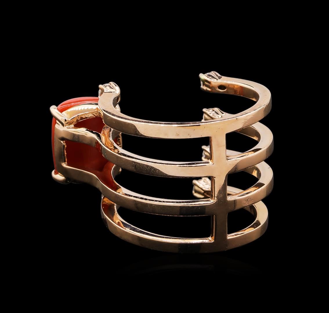 One electronically tested 14KT rose gold ladies cast coral and diamond ring with a bright polish finish. Identified with markings of "K14". Condition is new. Containing: One prong set oval cabochon cut natural pink coral, measuring 10.00 x 8.00 x 5.20mm, approximate weight of 3.06ct., clarity is heavily included, medium light, very slightly grayish, pink color, (GIA Pk 4/3), cut is good. Six prong set round brilliant cut diamonds, measuring 2.00 - 2.00 x 1.20mm (depth est.) approximate total weight of 6 Stones = 0.18ct. Clarity: SI-1 to I-1. Color: H - I, Cut is Good. Colored gemstones are presumed to have been subjected to commonly used enhancement processes. All diamonds and colored gemstones are graded in the mounting, unless otherwise stated. Total Weight of Colored Stones 3.06ct. Total Weight of Diamonds 0.18ct. Total Weight of Ring 7.80 grams. GGL Appraised.