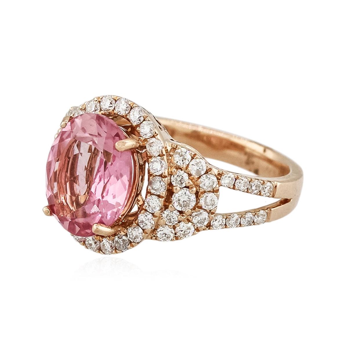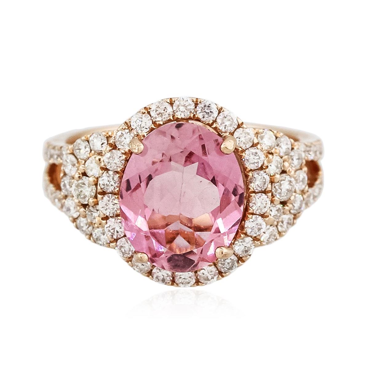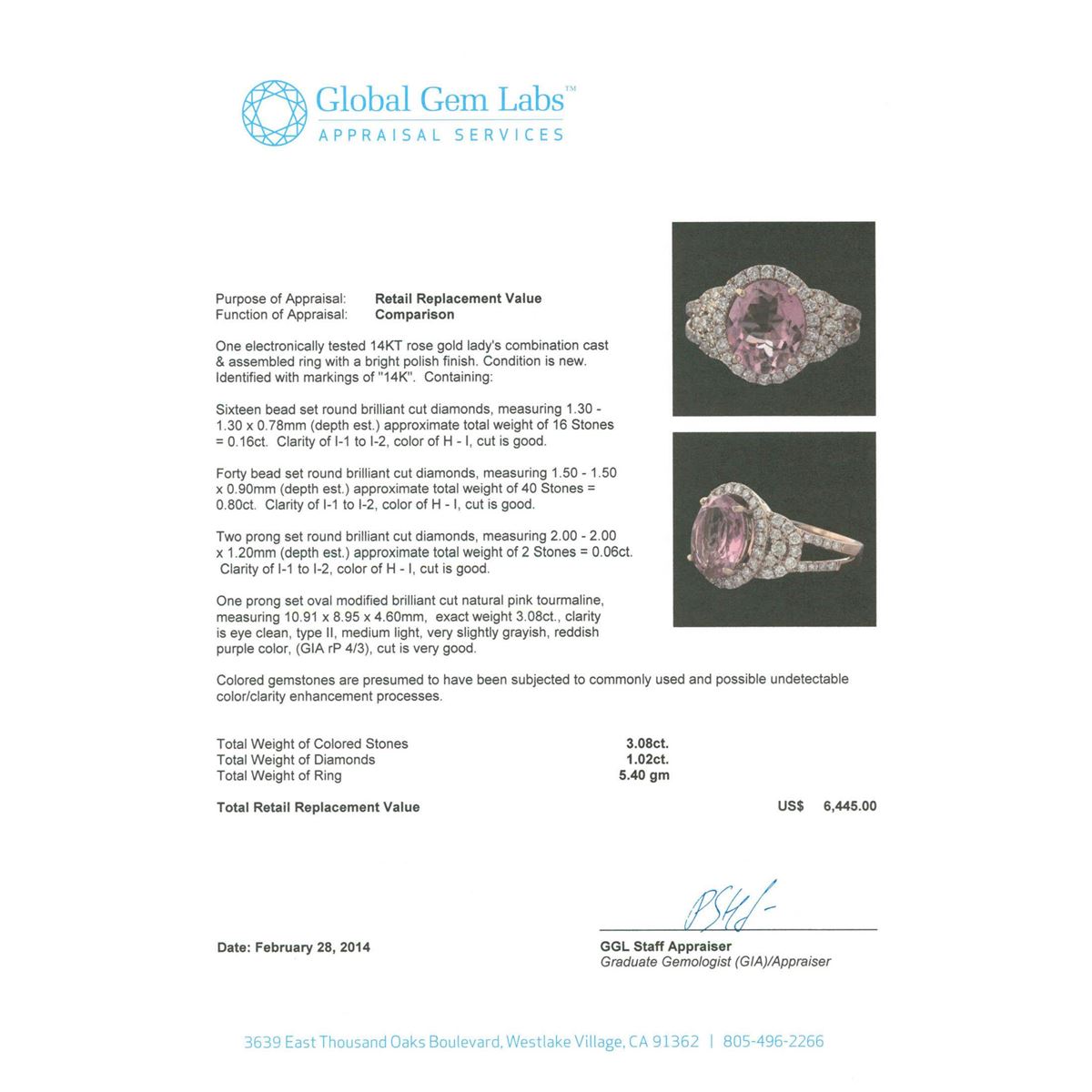 One electronically tested 14KT rose gold Ladies combination cast & assembled ring with a bright polish finish. Condition is new. Identified with markings of "14K". Containing: Sixteen bead set round brilliant cut diamonds, measuring 1.30 - 1.30 x 0.78mm (depth est.) approximate. Total Weight of 16 Stones = 0.16ct. Clarity: I-1 to I-2. Color: H - I, Cut is Good. Forty bead set round brilliant cut diamonds, measuring 1.50 - 1.50 x 0.90mm (depth est.) approximate. Total Weight of 40 Stones = 0.80ct. Clarity: I-1 to I-2. Color: H - I, Cut is Good. Two prong set round brilliant cut diamonds, measuring 2.00 - 2.00 x 1.20mm (depth est.) approximate. Total Weight of 2 Stones = 0.06ct. Clarity: I-1 to I-2. Color: H - I, Cut is Good. One prong set oval modified brilliant cut natural pink tourmaline, measuring 10.91 x 8.95 x 4.60mm, exact weight 3.08ct., clarity is eye clean, type II, medium light, very slightly grayish, reddish purple color, (GIA rP 4/3), cut is very good. Colored gemstones are presumed to have been subjected to commonly used and possible undetectable color/clarity enhancement processes. Total Weight of Colored Stones 3.08ct. Total Weight of Diamonds 1.02ct. Total Weight of Ring 5.40 grams. GGL Appraised at $6,445.00.