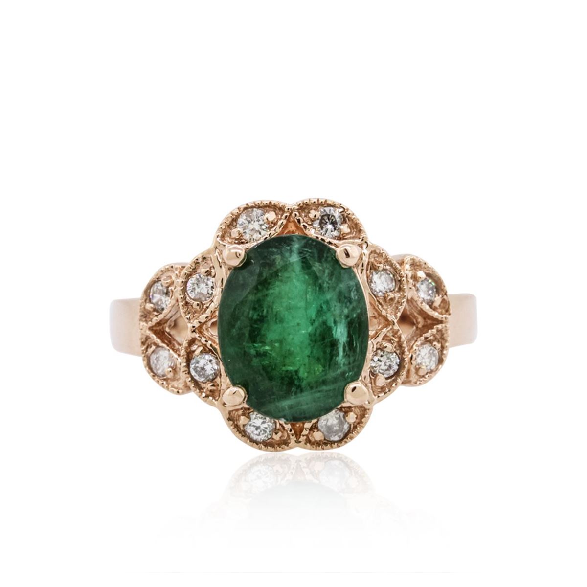 One ring featuring: 14KT rose gold weighing 5.90 grams containing one prong set oval cut emerald with a total weight of 3.08ct and pave set round cut diamonds with a total weight of 0.25cts.