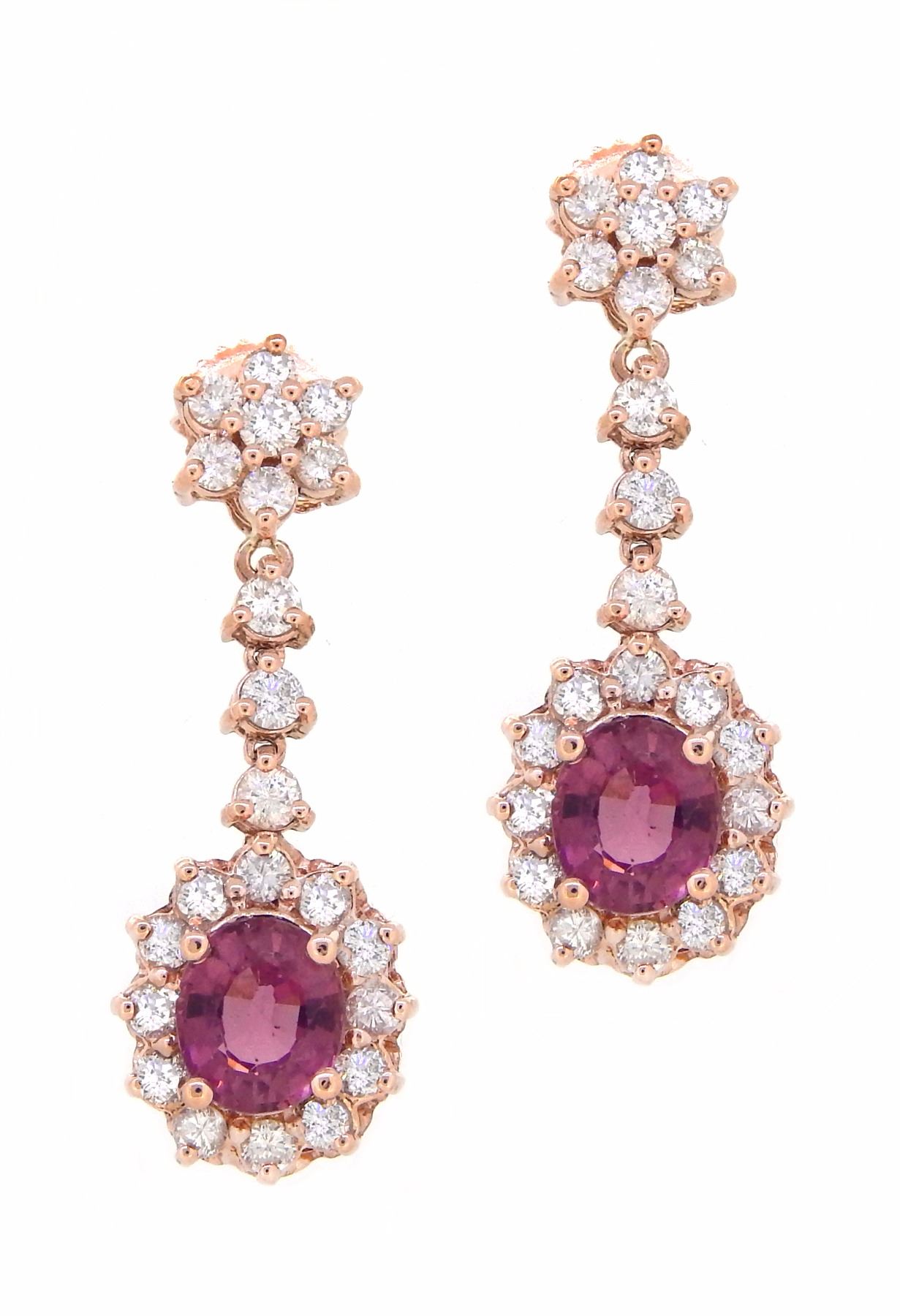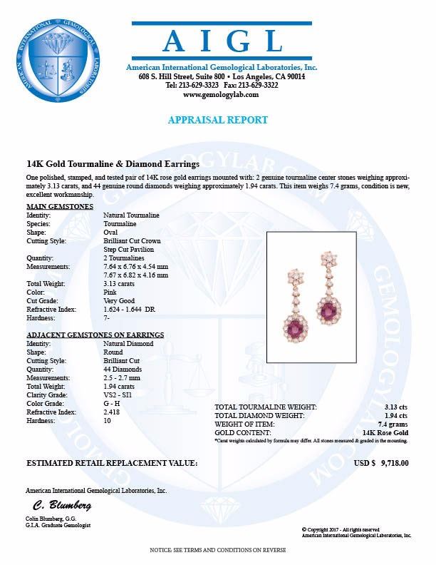 One 14KT Rose Gold 3.13ctw Tourmaline and Diamond Earrings. (2) Tourmaline stones with a total weight of 3.13cts. (44) Diamonds with a total weight of 1.94cts with a color of G-H and clarity of VS-2 to SI-1. Total weight of this ring is 7.4 grams.