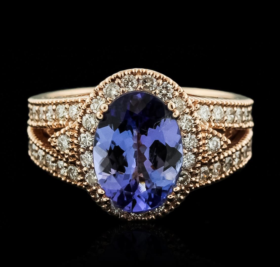 One electronically tested 14KT rose gold ladies cast tanzanite and diamond ring with a bright polish finish. Identified with markings of "K14". Condition is new. Containing: One prong set oval modified brilliant cut natural tanzanite, measuring 10.80 x 8.00 x 5.20mm, approximate weight of 3.16ct., clarity is eye clean, type I, medium, very slightly grayish, violet color, (GIA V 5/3), cut is good. Forty-Eight prong set round brilliant cut diamonds, measuring 1.50 - 1.50 x 0.90mm (depth est.) approximate total weight of 48 Stones = 0.59ct. Clarity: SI-1 to SI-2. Color: H - I, Cut is Good. Colored gemstones are presumed to have been subjected to commonly used enhancement processes. All diamonds and colored gemstones are graded in the mounting, unless otherwise stated. Total Weight of Colored Stones 3.16ct. Total Weight of Diamonds 0.59ct. Total Weight of Ring 7.80 grams. GGL Appraised at $5,310.00.