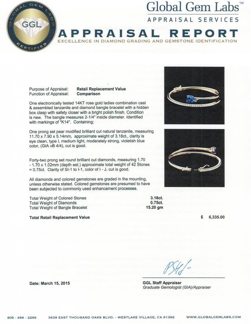 One electronically tested 14KT rose gold ladies combination cast & assembled tanzanite and diamond bangle bracelet with a hidden box clasp with safety closer with a bright polish finish. The bangle measures 2-1/4" inside diameter. Identified with markings of "K14". Condition is new. Containing: One prong set pear modified brilliant cut natural tanzanite, measuring 11.70 x 7.90 x 5.14mm, approximate weight of 3.18ct., clarity is eye clean, type I, medium light, moderately strong, violetish blue color, (GIA vB 4/4), cut is good. Forty-Two prong set round brilliant cut diamonds, measuring 1.70 - 1.70 x 1.02mm (depth est.) approximate total weight of 42 Stones = 0.75ct. Clarity of SI-1 to I-1, Color of I - J, Cut is Good. All diamonds and colored gemstones are graded in the mounting, unless otherwise stated. Colored gemstones are presumed to have been subjected to commonly used enhancement processes. Total Weight of Colored Stones 3.18ct. Total Weight of Diamonds 0.75ct. Total Weight of Bangle Bracelet 15.20 grams. GGL Appraised at $6,335.00.