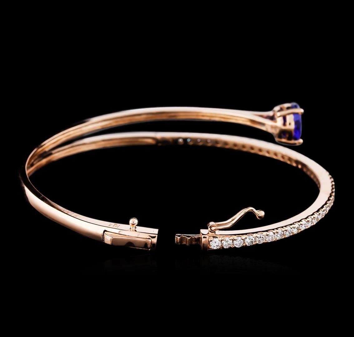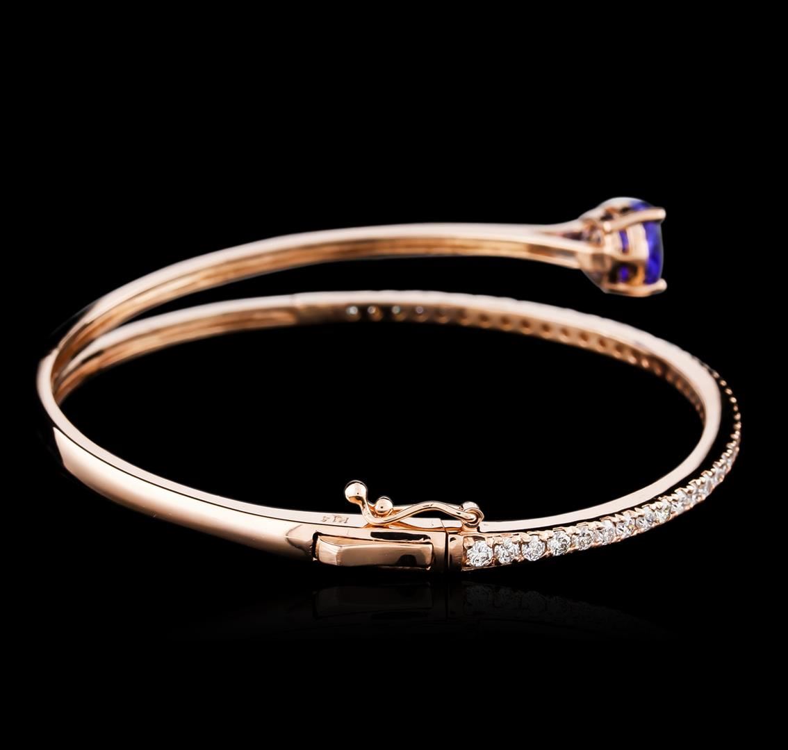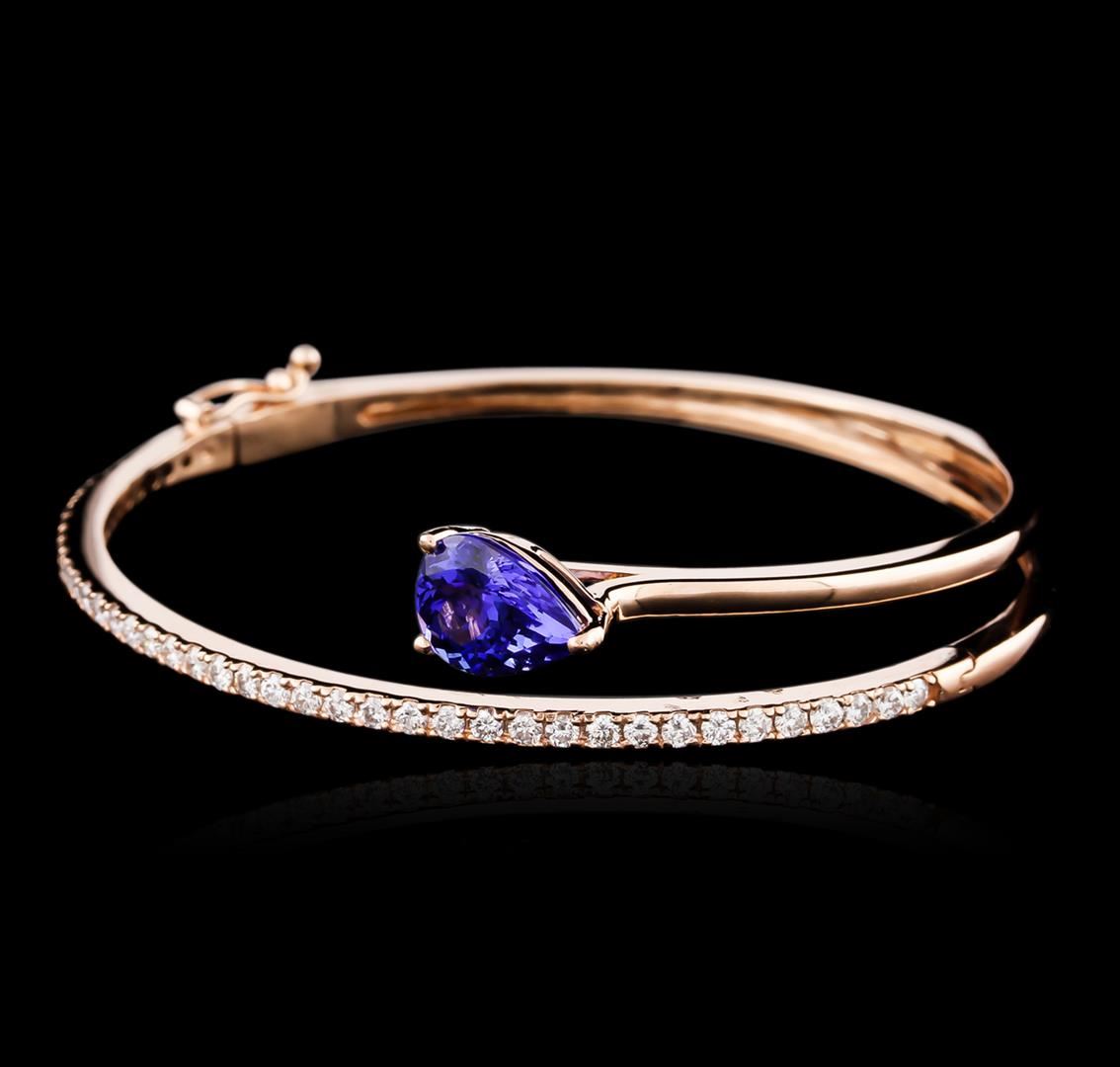 One electronically tested 14KT rose gold ladies combination cast & assembled tanzanite and diamond bangle bracelet with a hidden box clasp with safety closer with a bright polish finish. The bangle measures 2-1/4" inside diameter. Identified with markings of "K14". Condition is new. Containing: One prong set pear modified brilliant cut natural tanzanite, measuring 11.70 x 7.90 x 5.14mm, approximate weight of 3.18ct., clarity is eye clean, type I, medium light, moderately strong, violetish blue color, (GIA vB 4/4), cut is good. Forty-Two prong set round brilliant cut diamonds, measuring 1.70 - 1.70 x 1.02mm (depth est.) approximate total weight of 42 Stones = 0.75ct. Clarity of SI-1 to I-1, Color of I - J, Cut is Good. All diamonds and colored gemstones are graded in the mounting, unless otherwise stated. Colored gemstones are presumed to have been subjected to commonly used enhancement processes. Total Weight of Colored Stones 3.18ct. Total Weight of Diamonds 0.75ct. Total Weight of Bangle Bracelet 15.20 grams. GGL Appraised at $6,335.00.